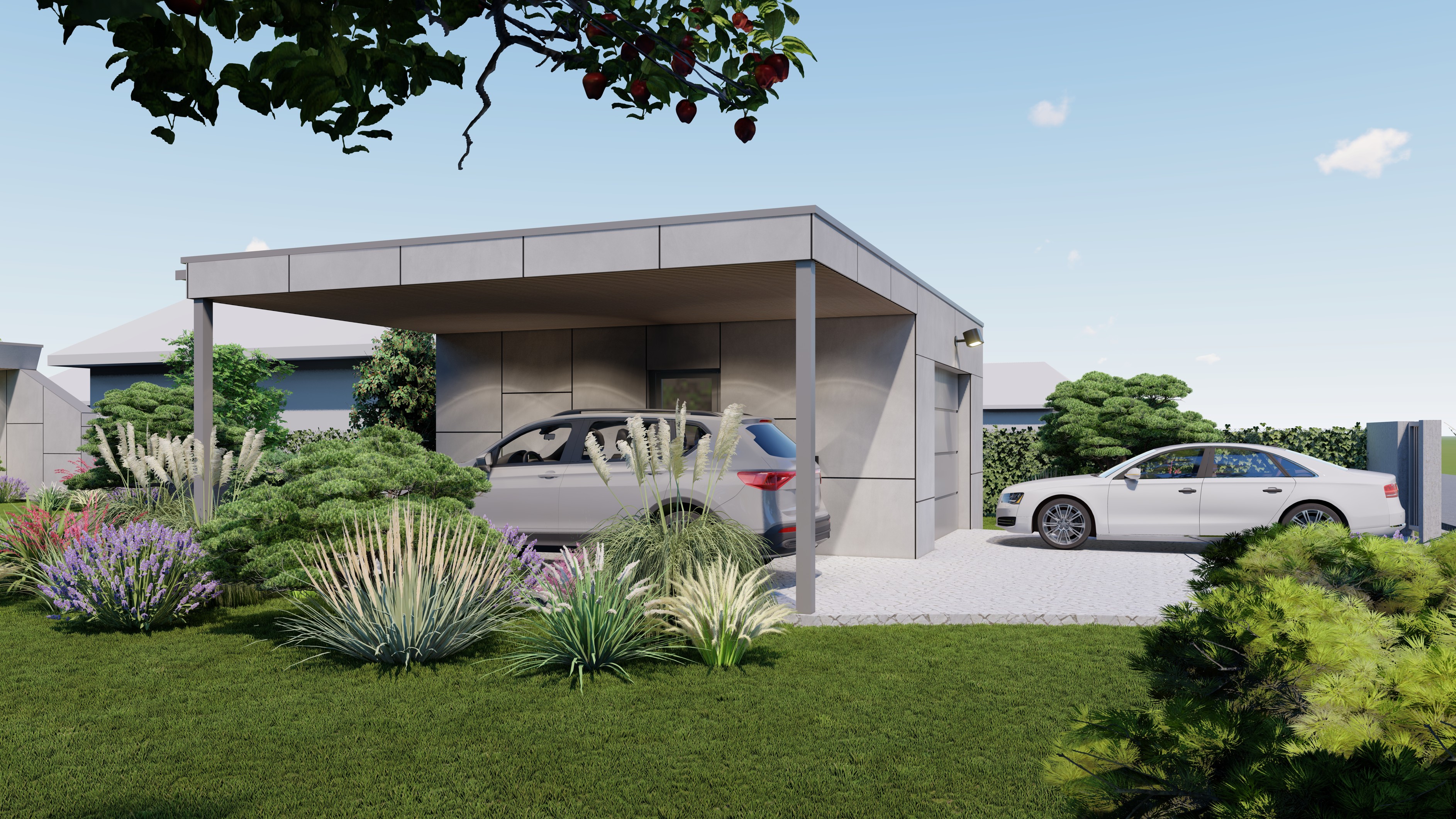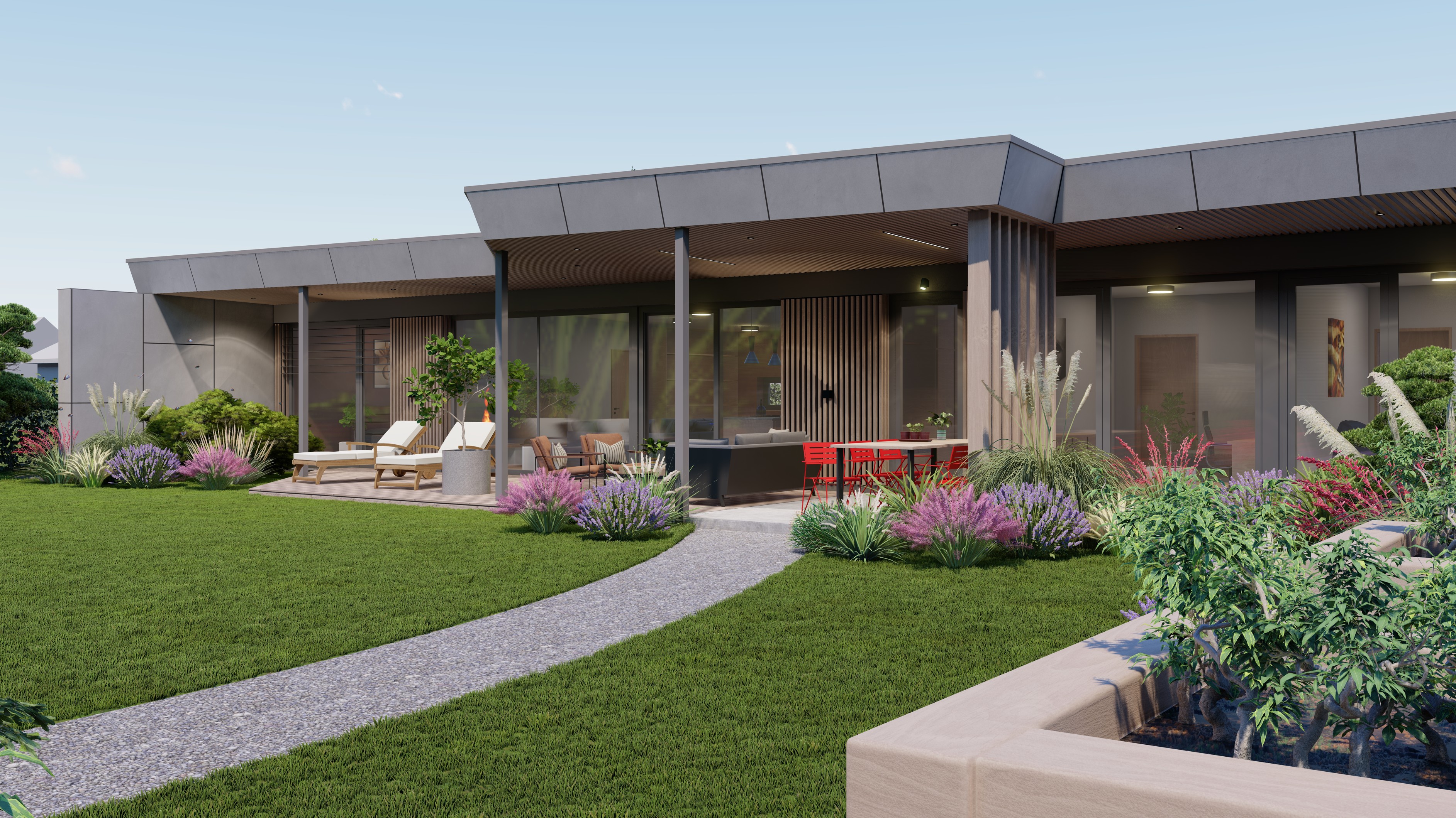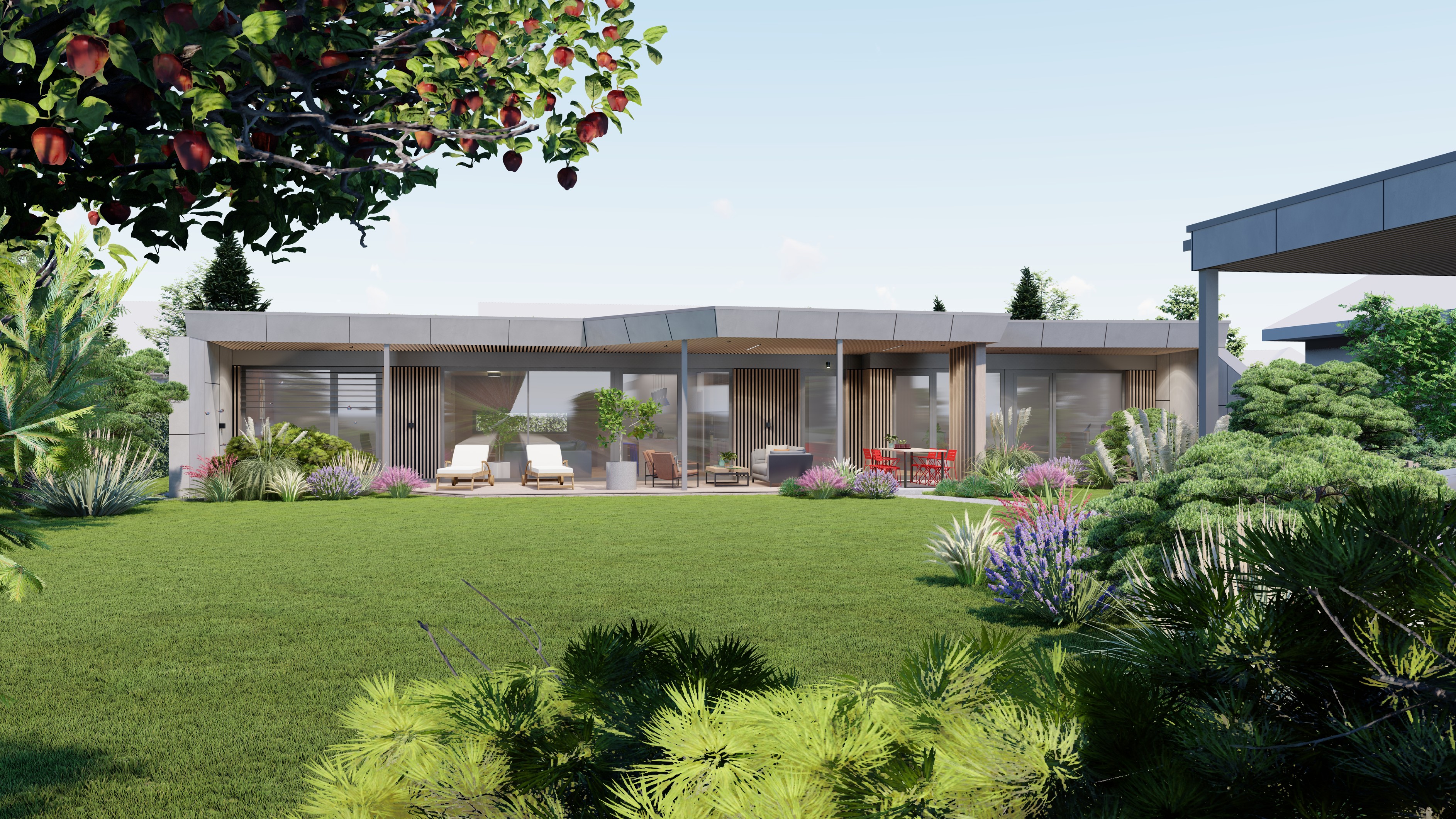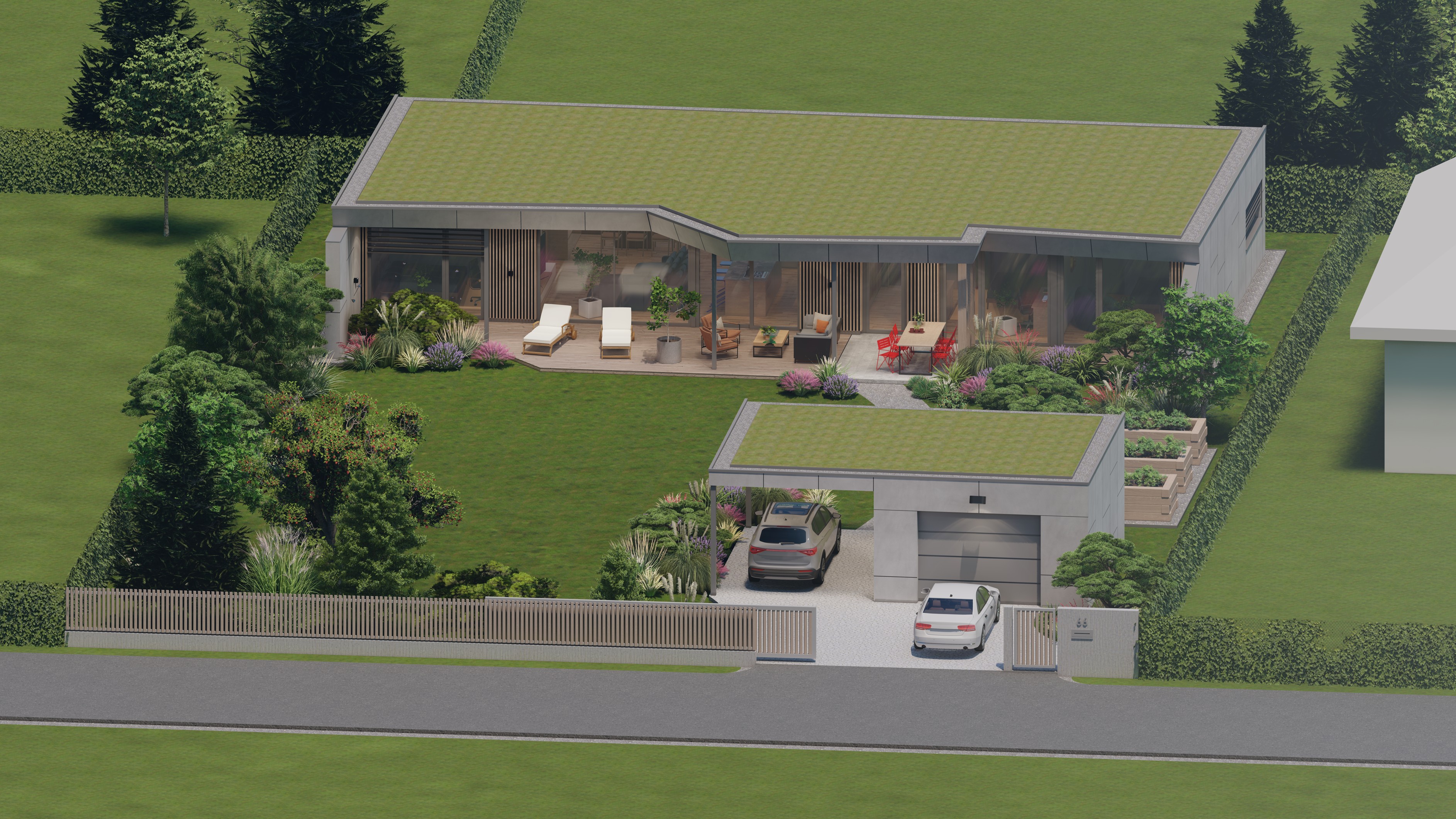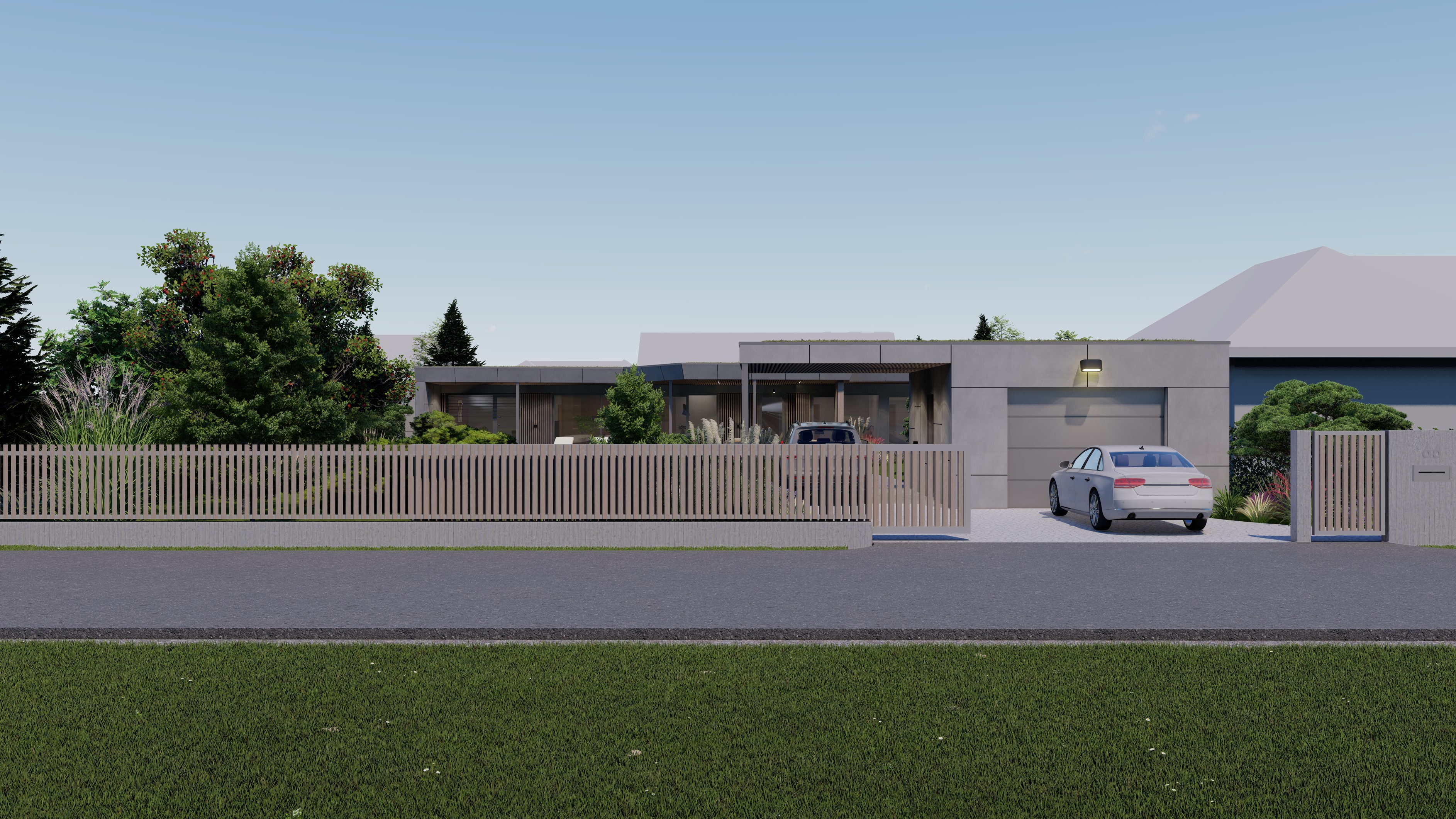 PŘÍZEMNÍ DŮM S GARÁŽÍ A PŘÍSTŘEŠKEM PRO PARKOVÁNÍ. POZEMEK JE OBDÉLNÍKOVÉHO TVARU, SKLONITÝ OD SEVERU K JIHU. NA JIŽNÍ STRANĚ JE VJEZD NA POZEMEK, NA KTERÝ NAVAZUJE GARÁŽ. ZA NÍ SE ROZVÍJÍ ZAHRADA, KTERÁ JE AŽ K SAMOTNÉ STAVBĚ DOMU, KTERÝ JE USAZEN K SEVERNÍ HRANICI POZEMKU, ABY ZAHRADA BYLA CO NEJVĚTŠÍ. VŠECHNY OBYTNÉ MÍSTNOSTI JSOU OTEVŘENY DO ZAHRADY.