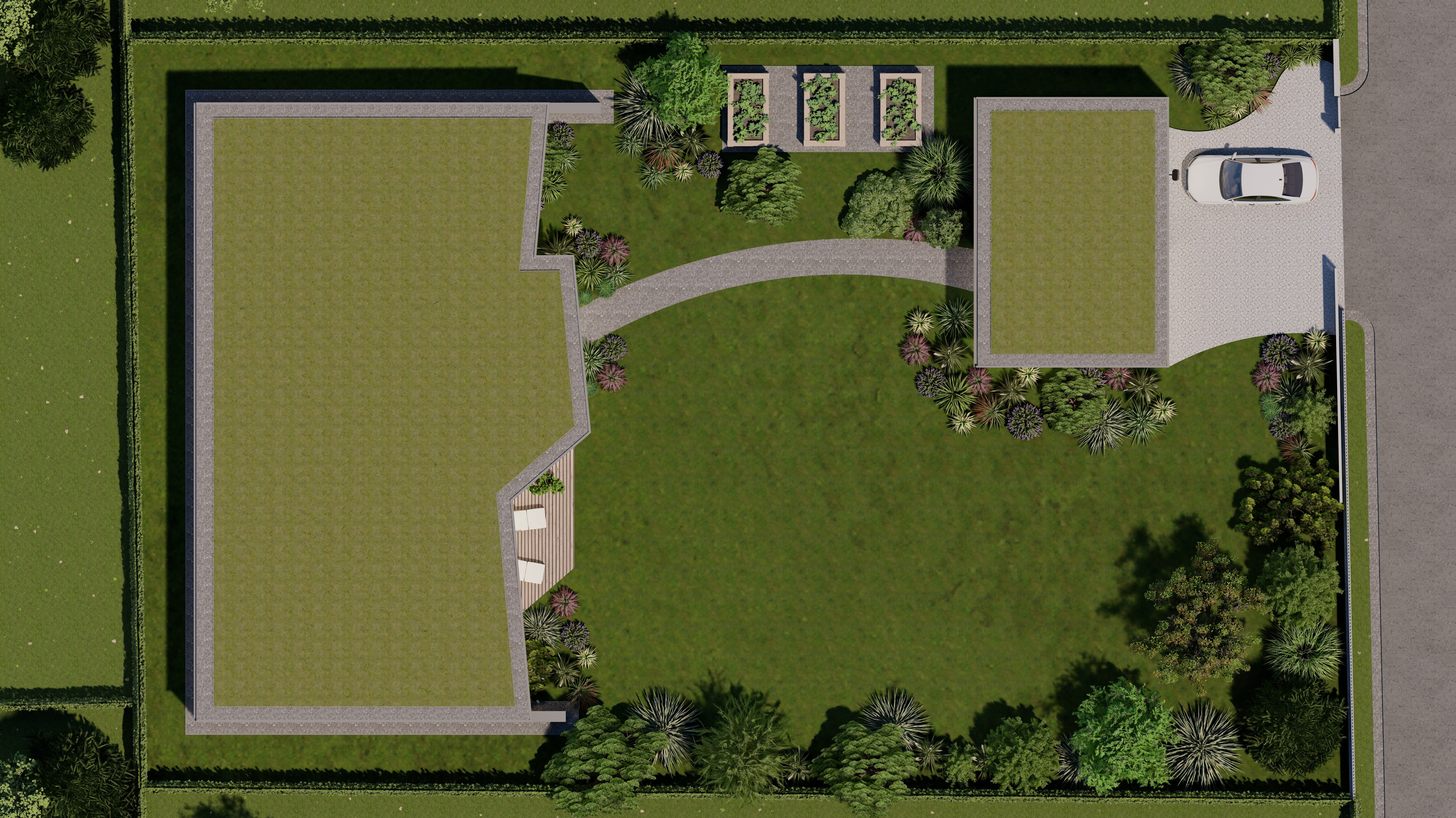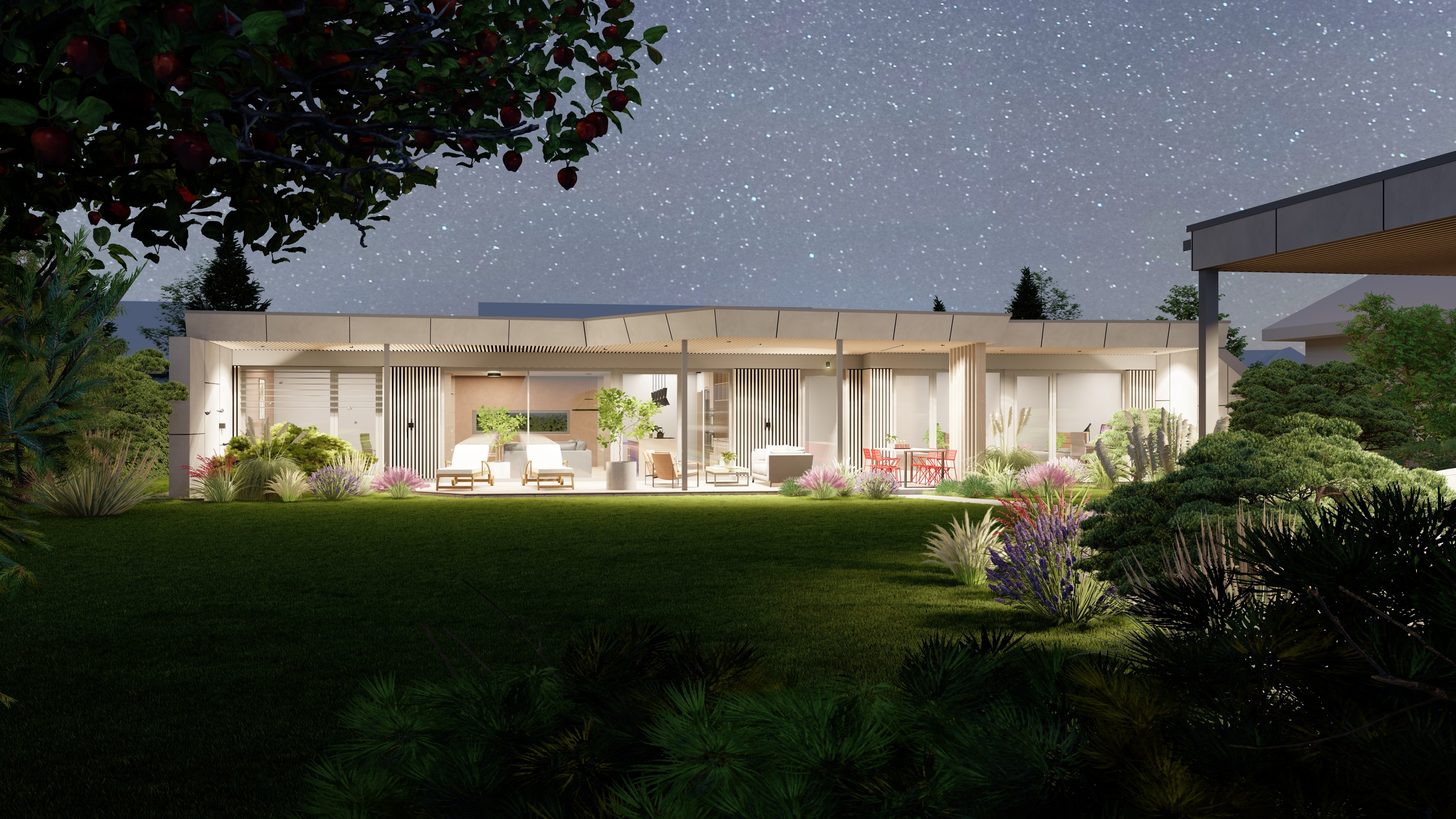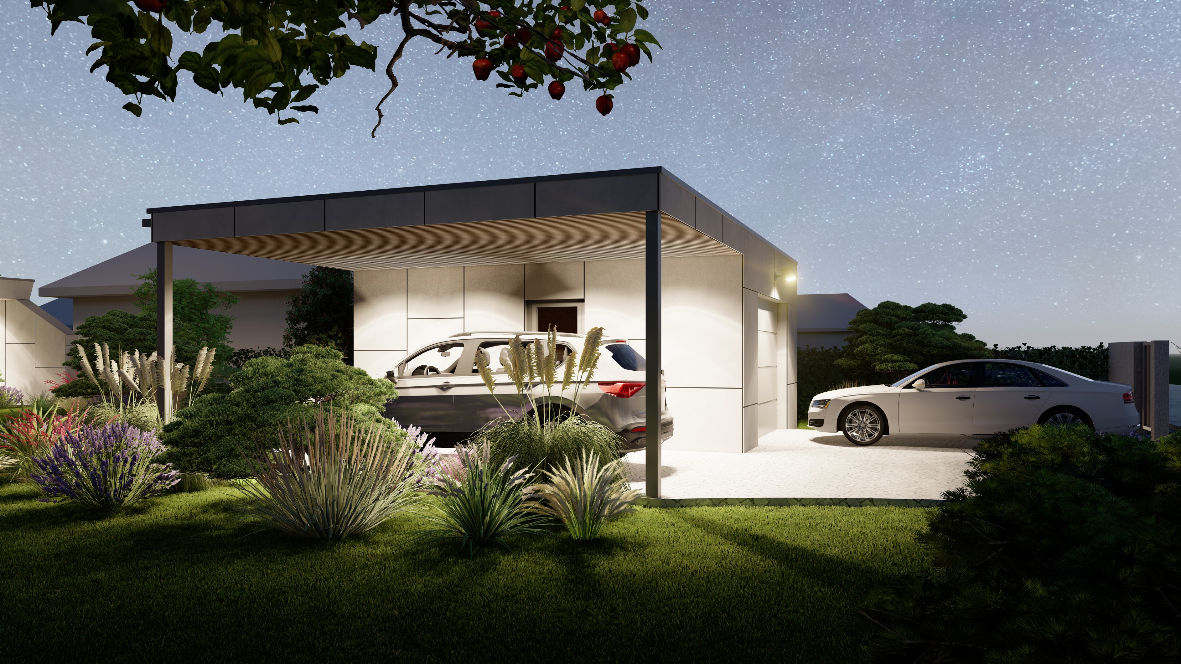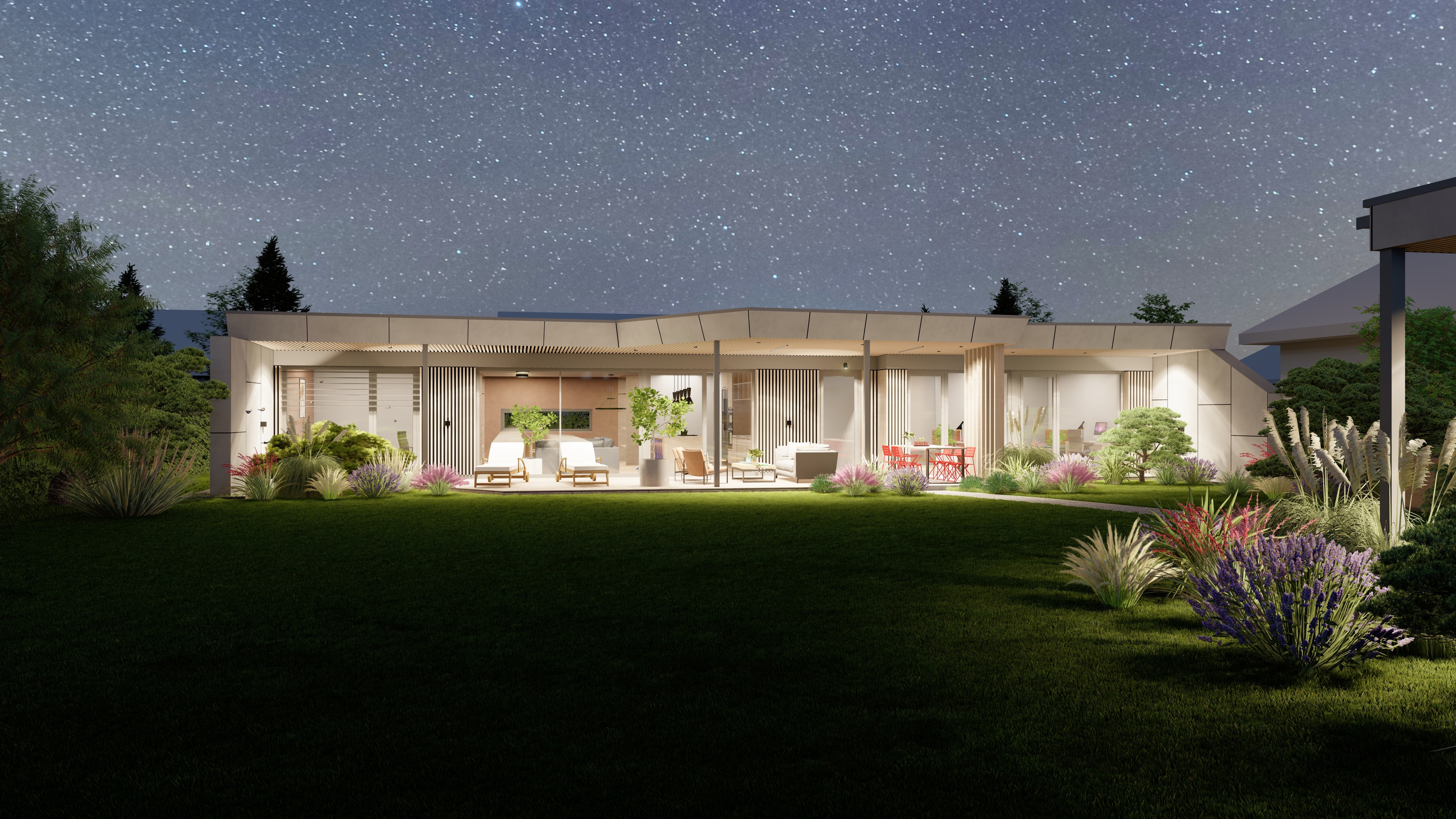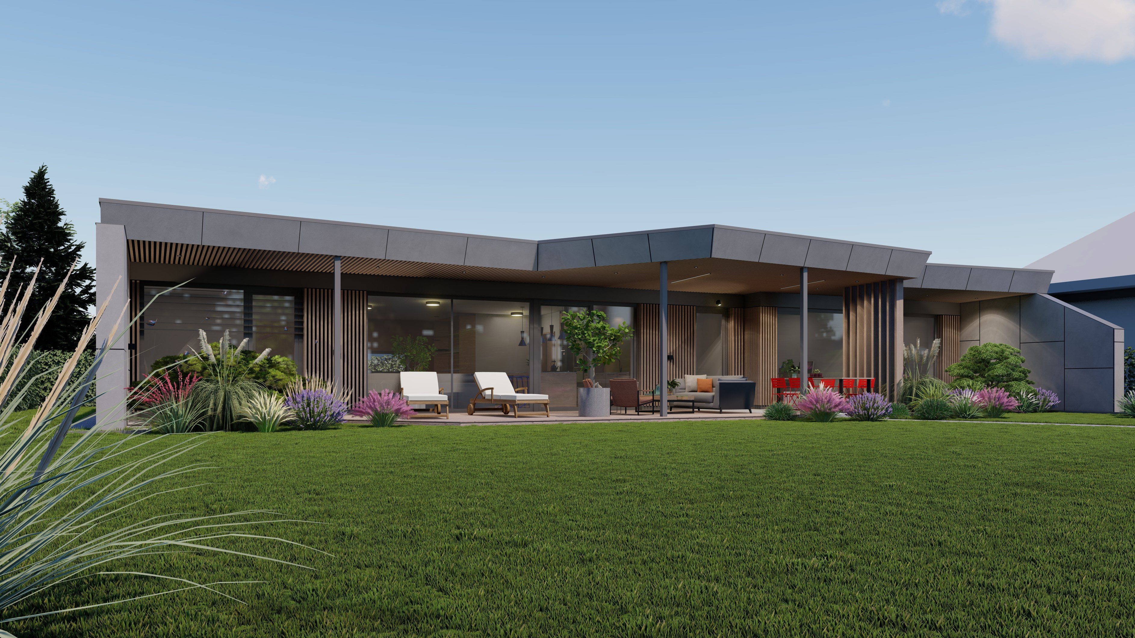 PŘÍZEMNÍ DŮM S GARÁŽÍ A PŘÍSTŘEŠKEM PRO PARKOVÁNÍ. POZEMEK JE OBDÉLNÍKOVÉHO TVARU, SKLONITÝ OD SEVERU K JIHU. NA JIŽNÍ STRANĚ JE VJEZD NA POZEMEK, NA KTERÝ NAVAZUJE GARÁŽ. ZA NÍ SE ROZVÍJÍ ZAHRADA, KTERÁ JE AŽ K SAMOTNÉ STAVBĚ DOMU, KTERÝ JE USAZEN K SEVERNÍ HRANICI POZEMKU, ABY ZAHRADA BYLA CO NEJVĚTŠÍ. VŠECHNY OBYTNÉ MÍSTNOSTI JSOU OTEVŘENY DO ZAHRADY.