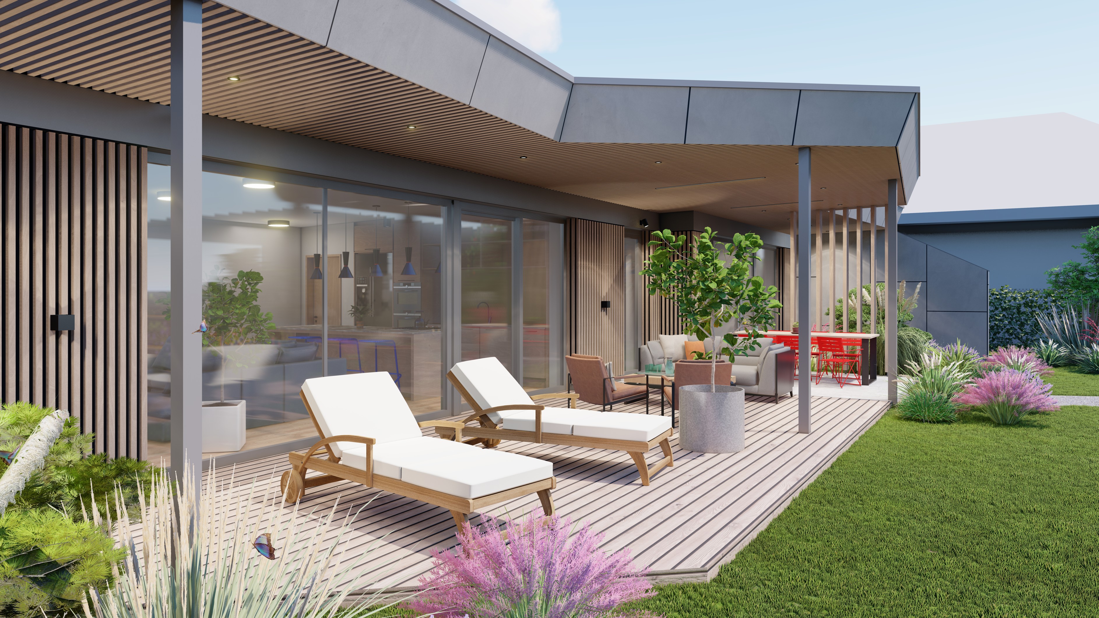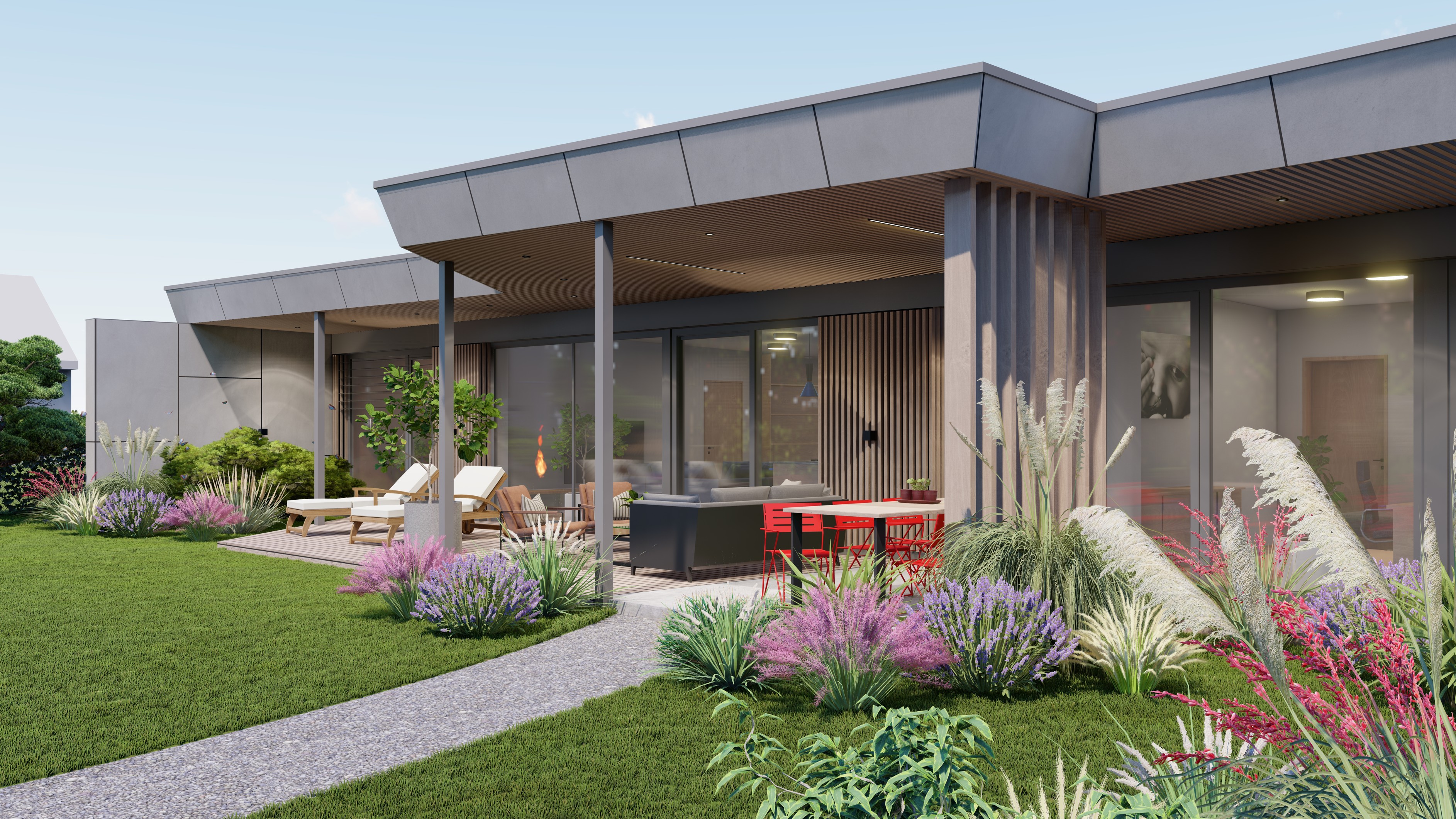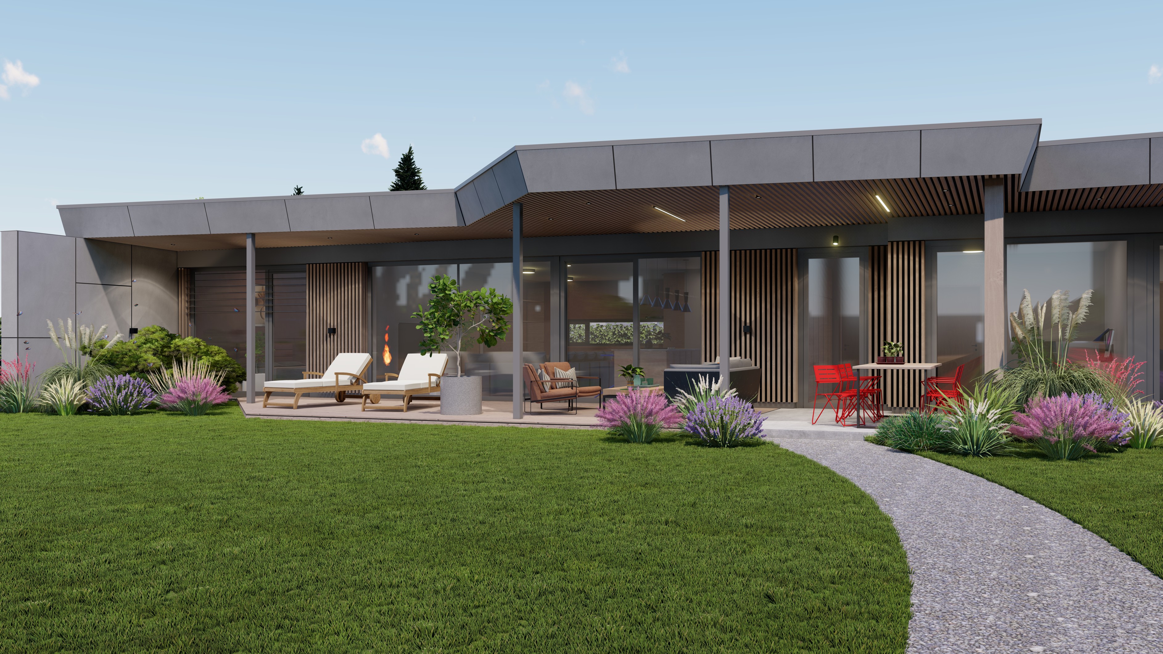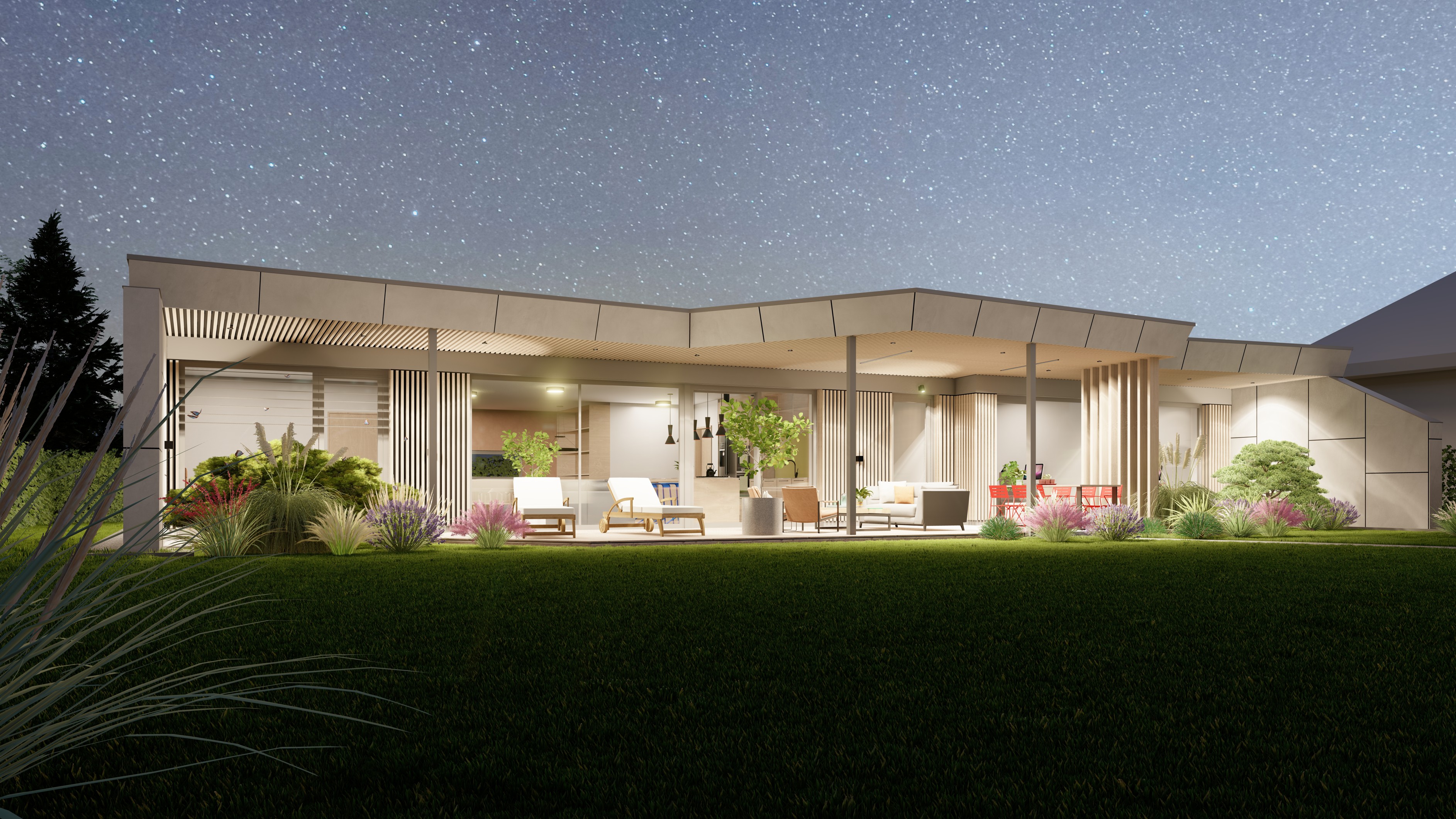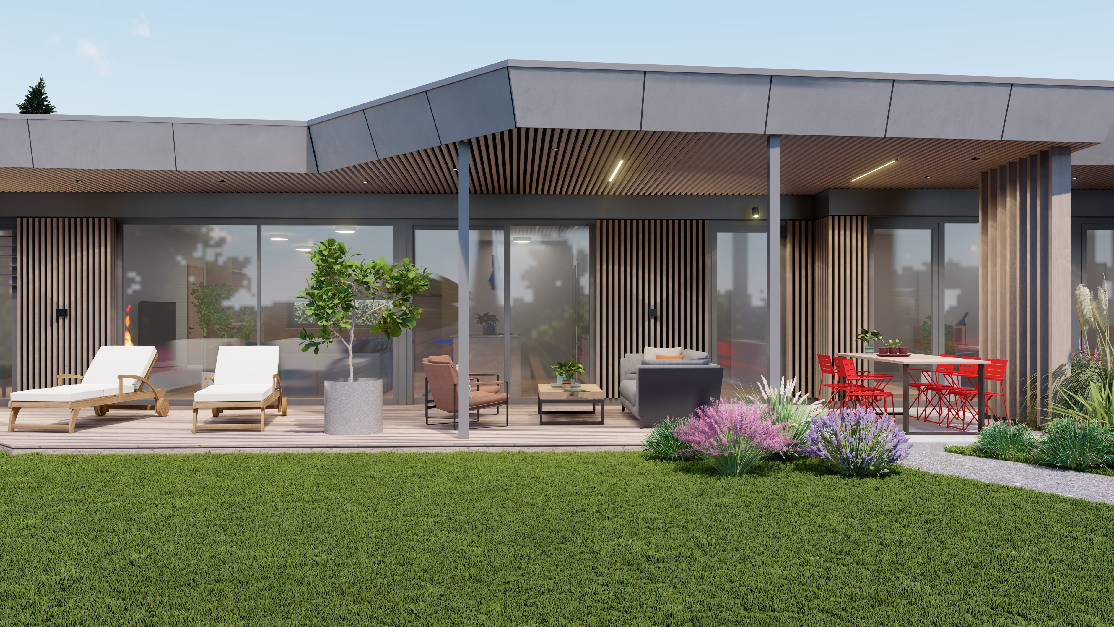 PŘÍZEMNÍ DŮM S GARÁŽÍ A PŘÍSTŘEŠKEM PRO PARKOVÁNÍ. POZEMEK JE OBDÉLNÍKOVÉHO TVARU, SKLONITÝ OD SEVERU K JIHU. NA JIŽNÍ STRANĚ JE VJEZD NA POZEMEK, NA KTERÝ NAVAZUJE GARÁŽ. ZA NÍ SE ROZVÍJÍ ZAHRADA, KTERÁ JE AŽ K SAMOTNÉ STAVBĚ DOMU, KTERÝ JE USAZEN K SEVERNÍ HRANICI POZEMKU, ABY ZAHRADA BYLA CO NEJVĚTŠÍ. VŠECHNY OBYTNÉ MÍSTNOSTI JSOU OTEVŘENY DO ZAHRADY.