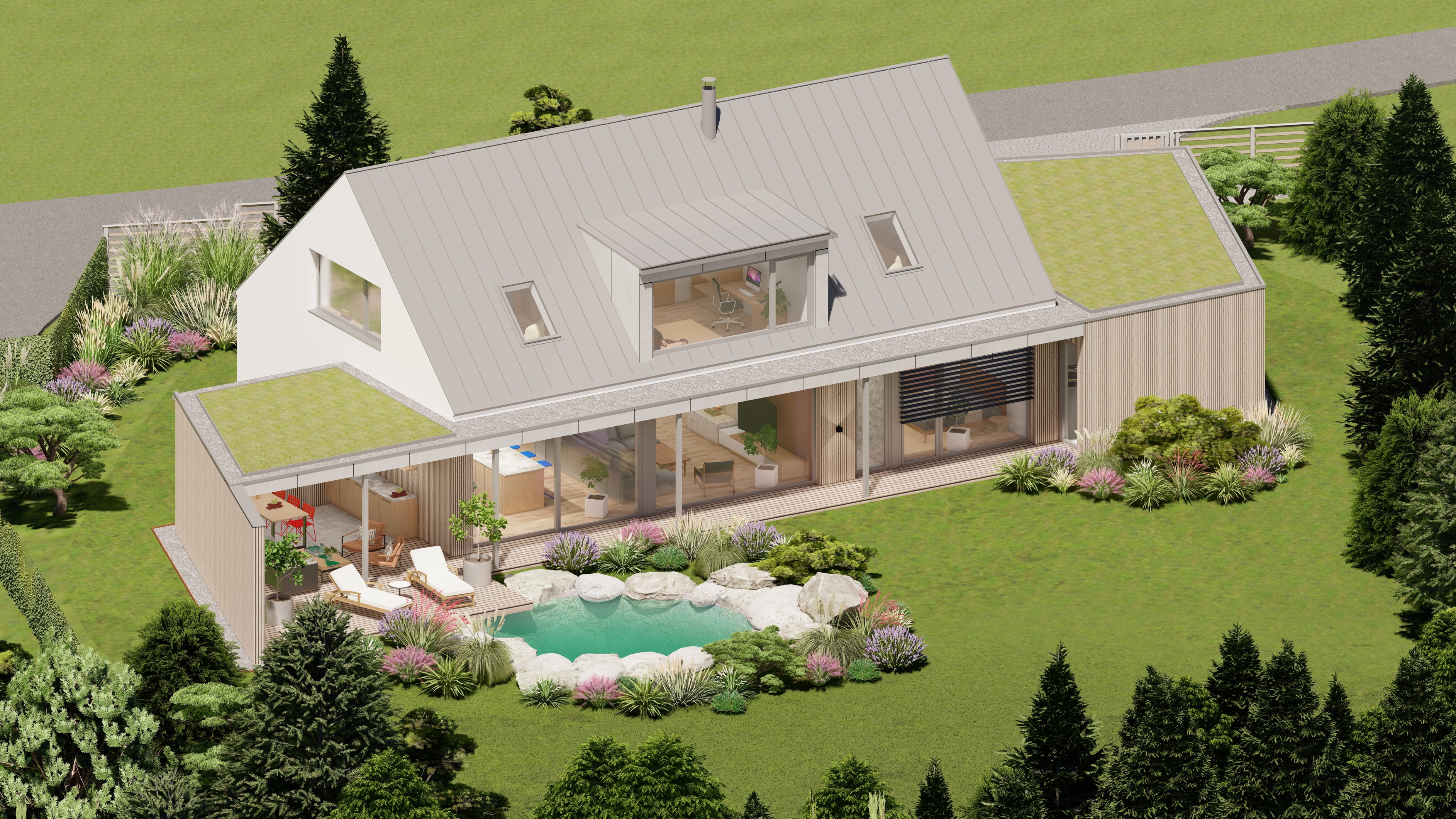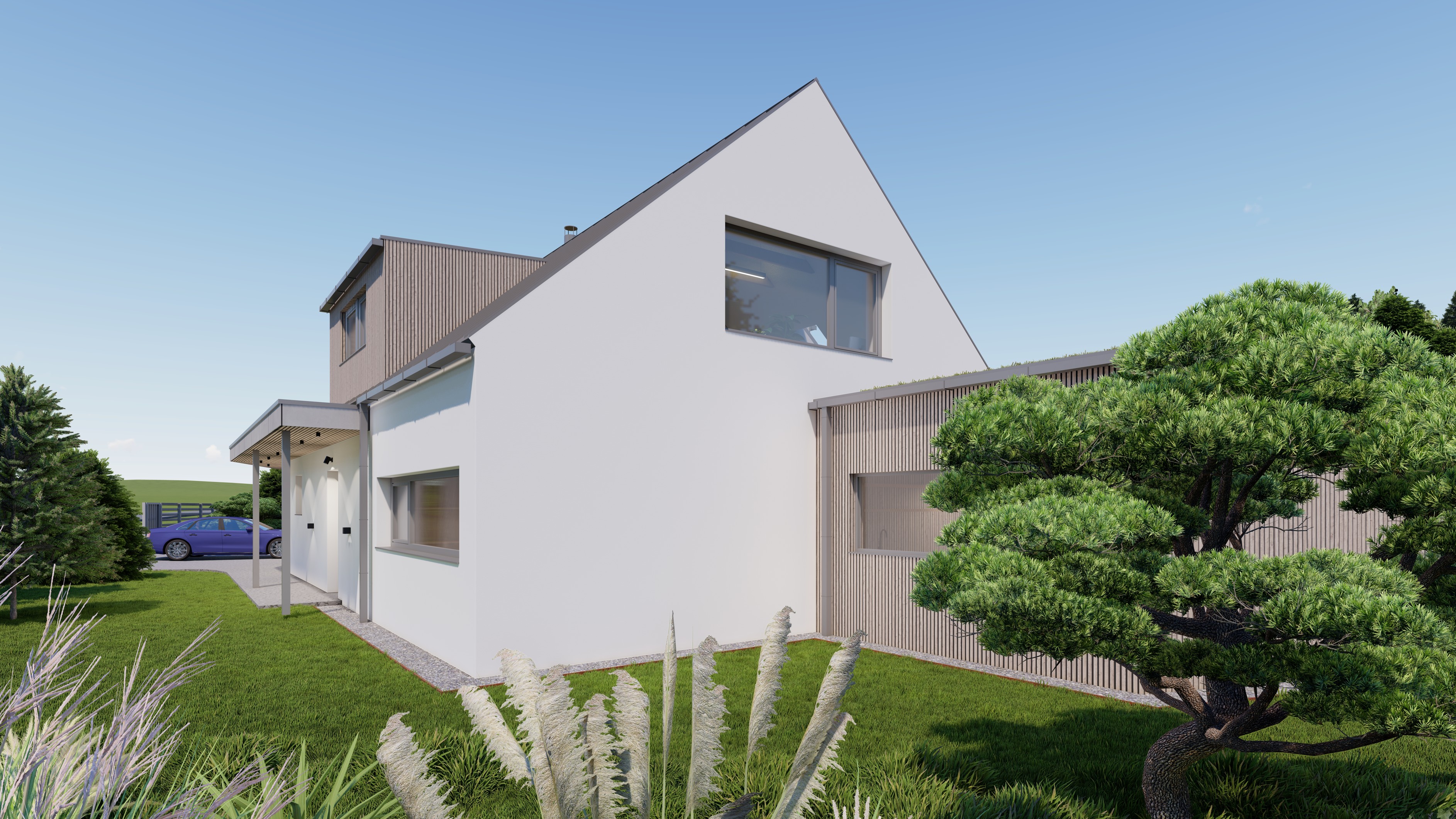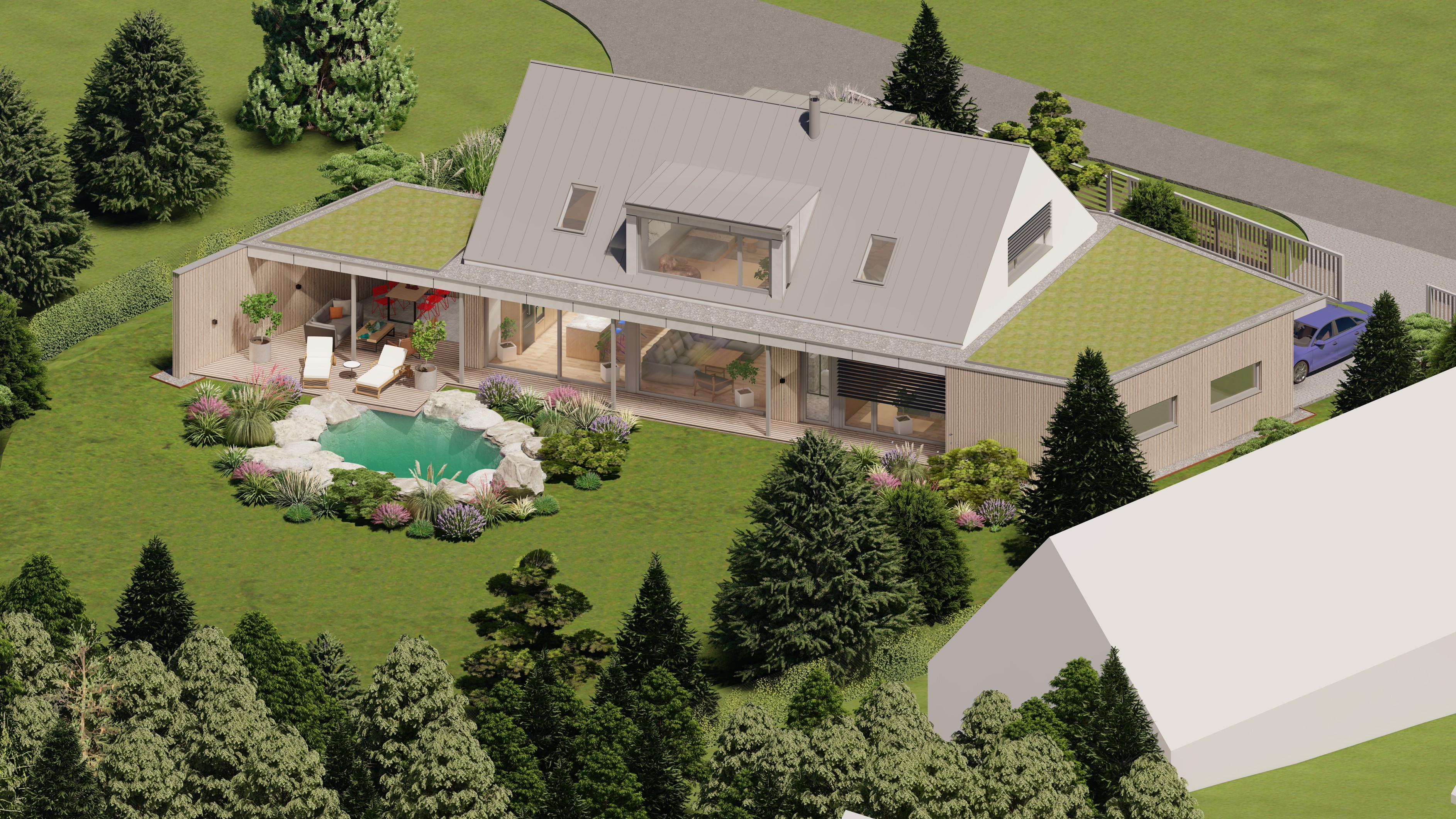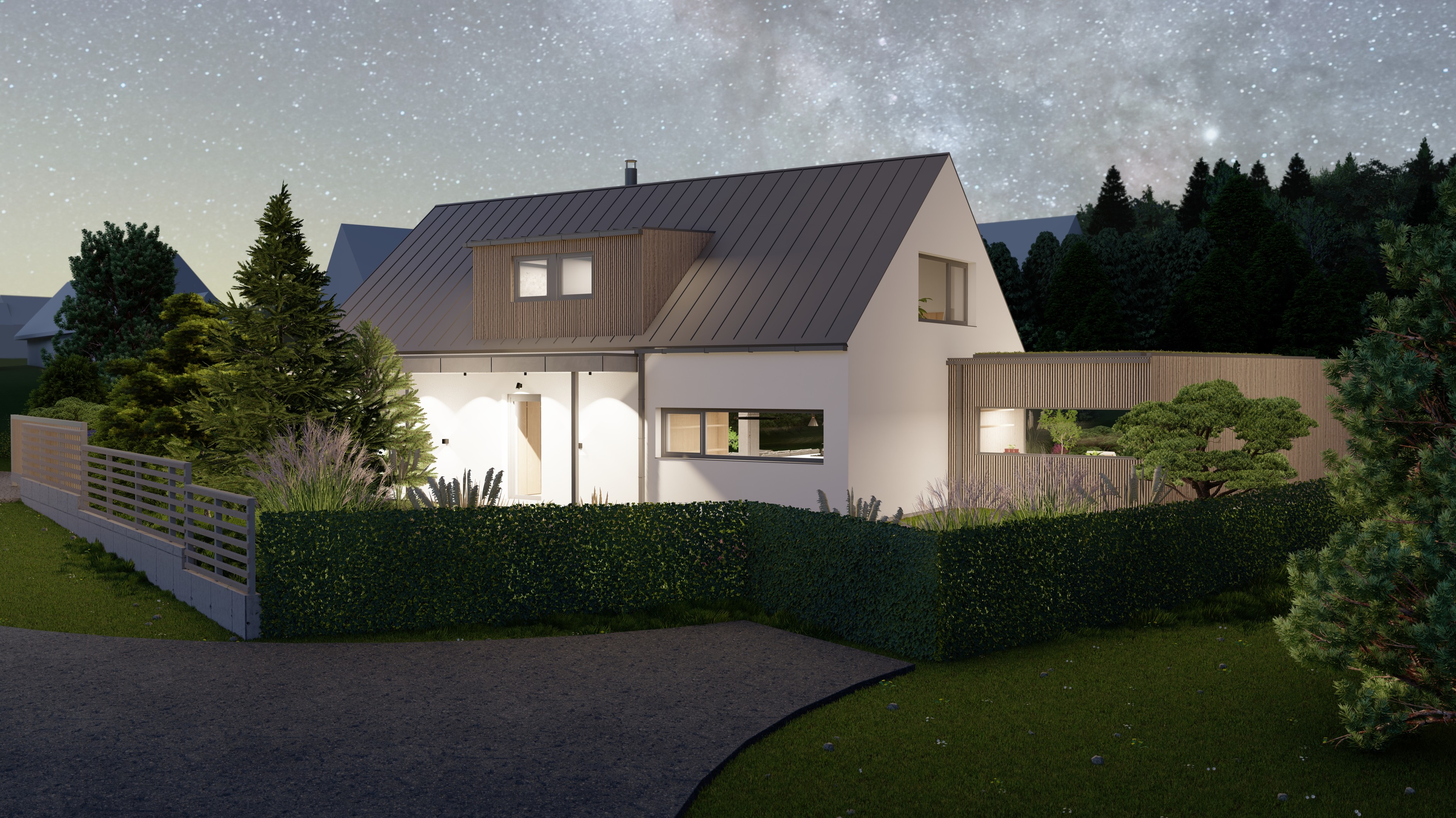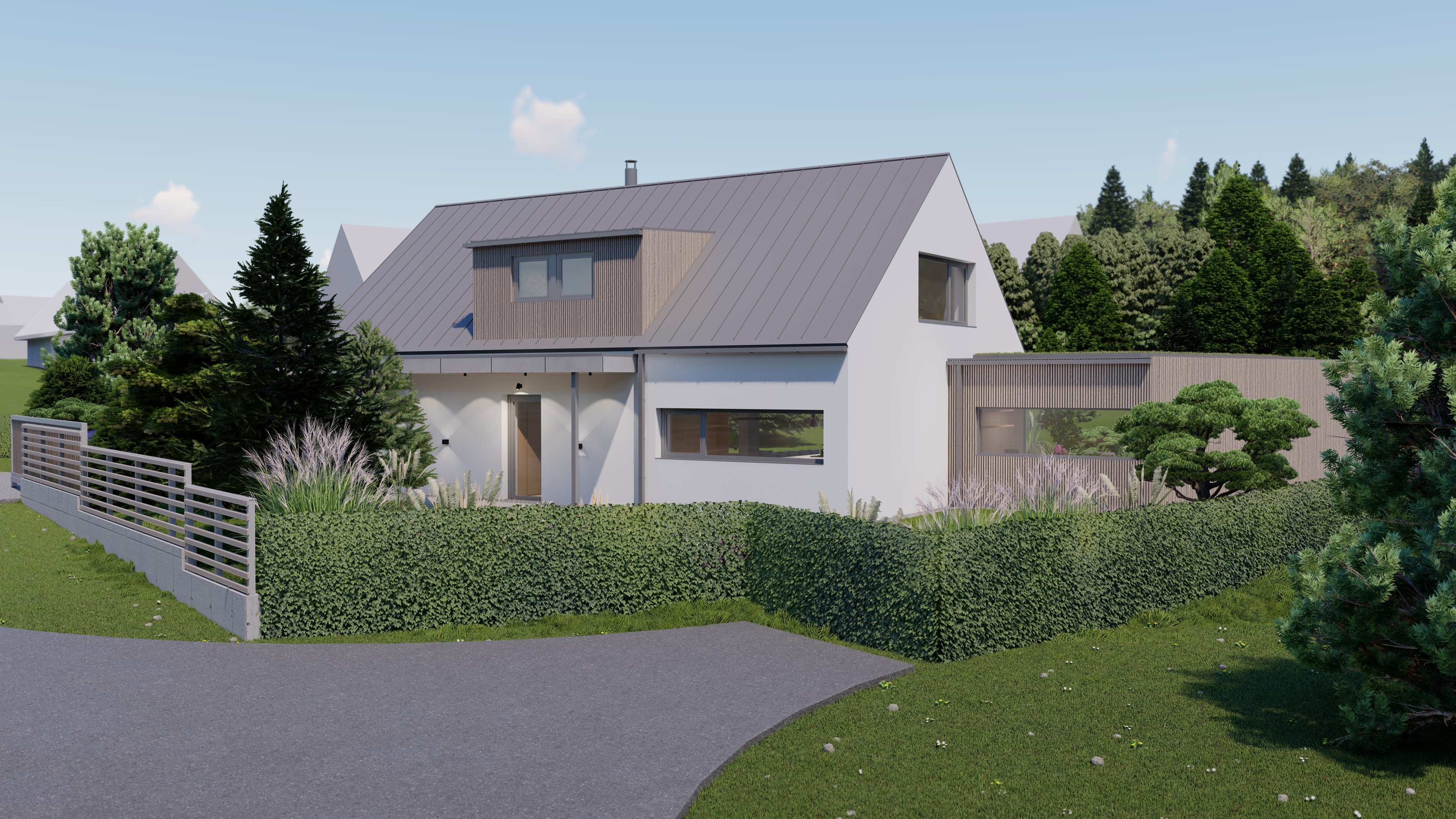 POZEMEK LEŽÍ VE VESNICI HLÁSNÁ LHOTA, NEDALEKO JIČÍNA. JEDNÁ SE O OBJEKT RODINNÉHO DOMU, PROVOZNĚ SPOJENÝ S GARÁŽÍ A TERASOU. HMOTA DOMU JE PATRNÁ PODLE ŠIKMÉ STŘECHY, KTERÁ ZASTŘEŠUJE ČÁST DOMU. PLOCHÁ STŘECHA NAVAZUJÍCÍ HMOTY JE Z JEDNÉ STRANY GARÁŽÍ A Z DRUHÉ STRANY PŘYKRYTOU TERASOU, NA KTEROU NAVAZUJE KOUPACÍ JEZÍRKO.