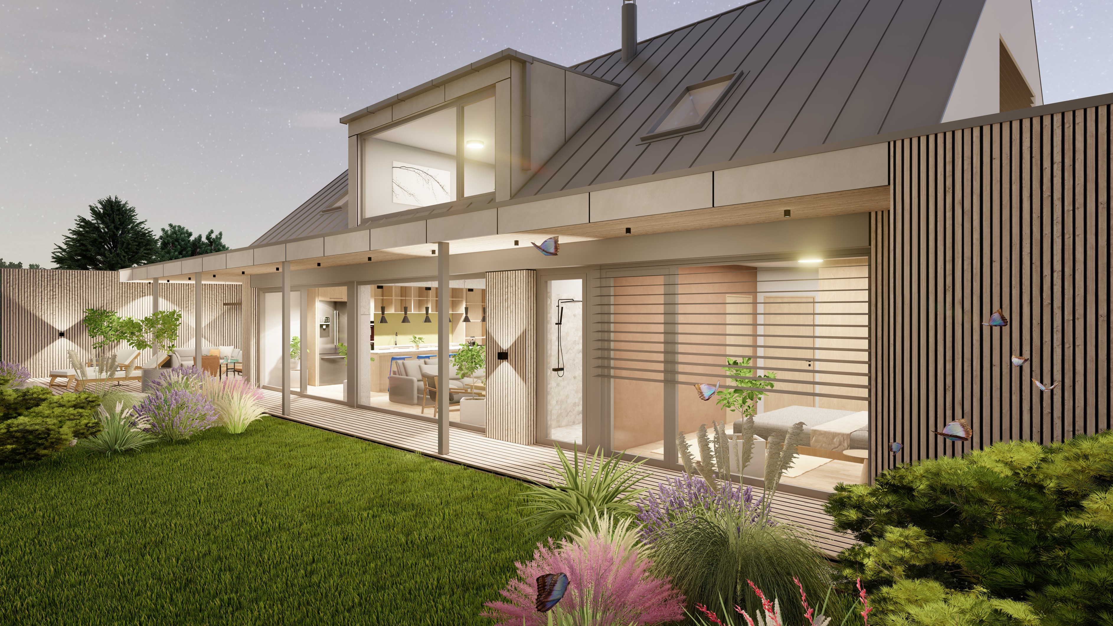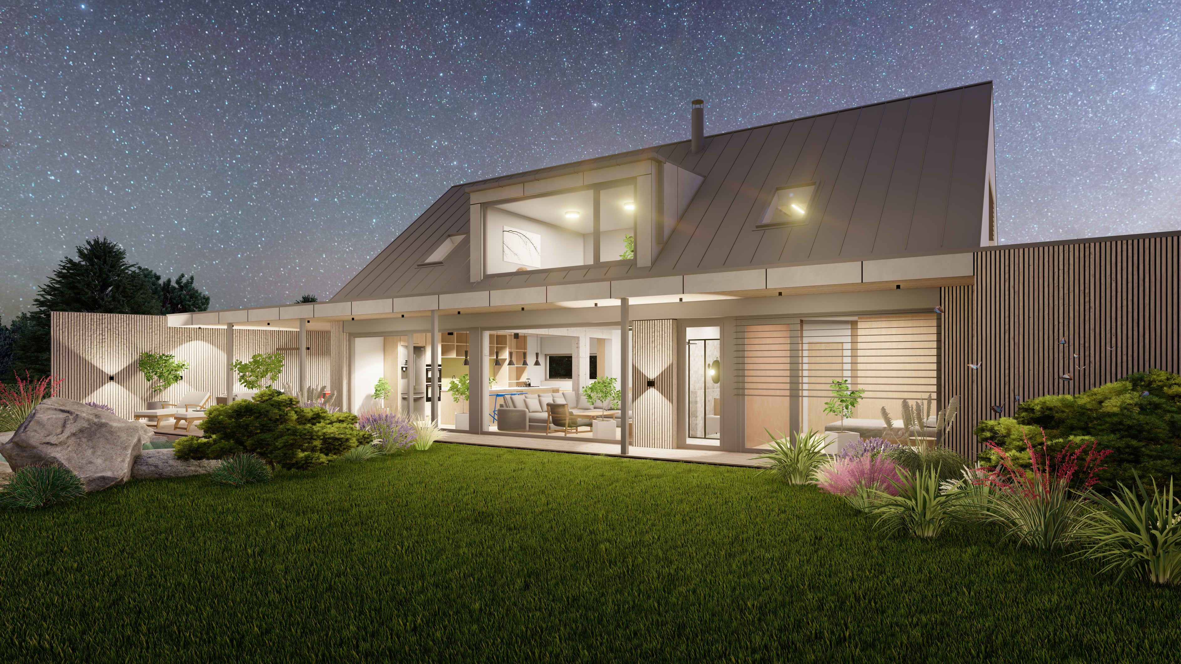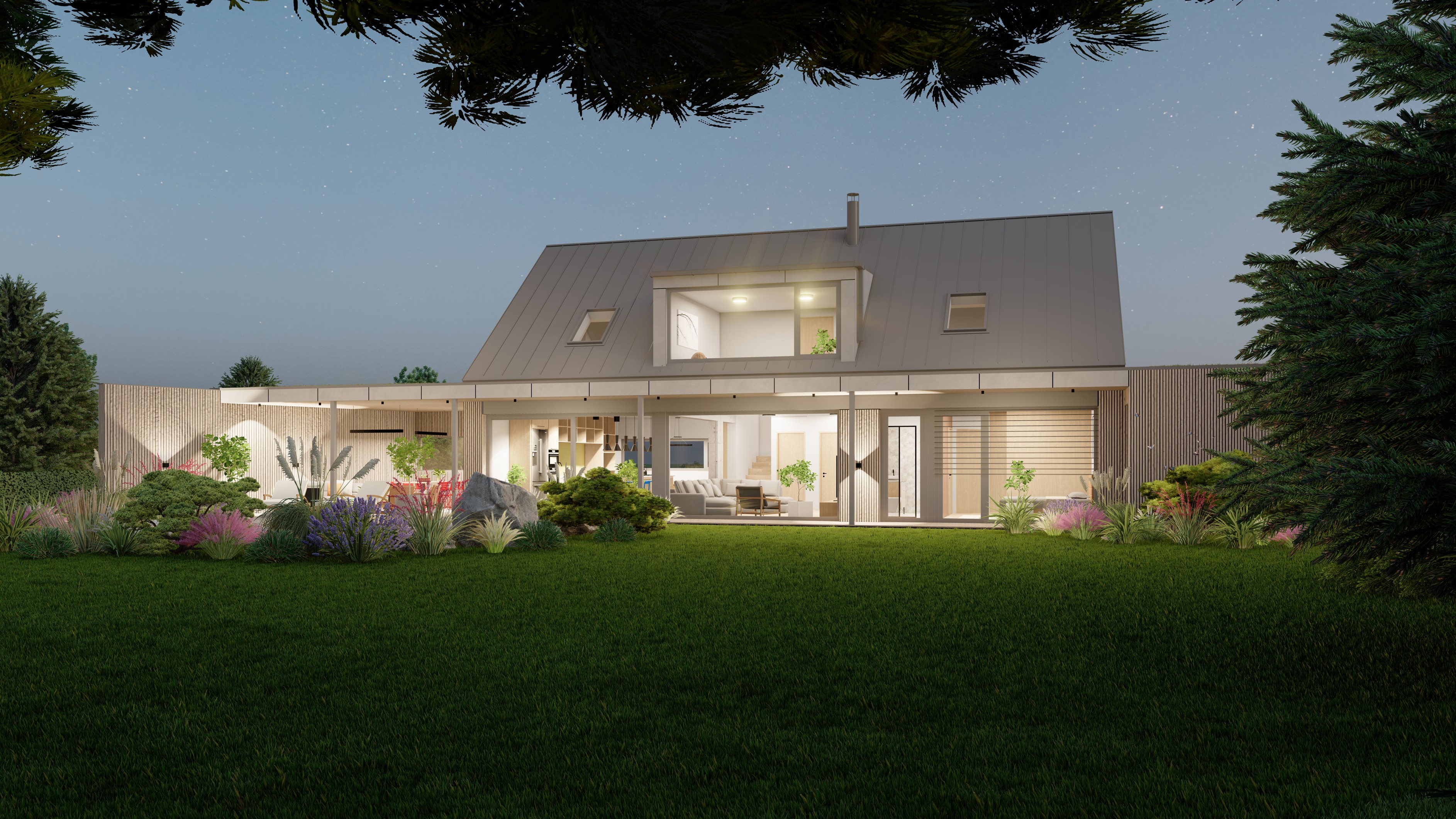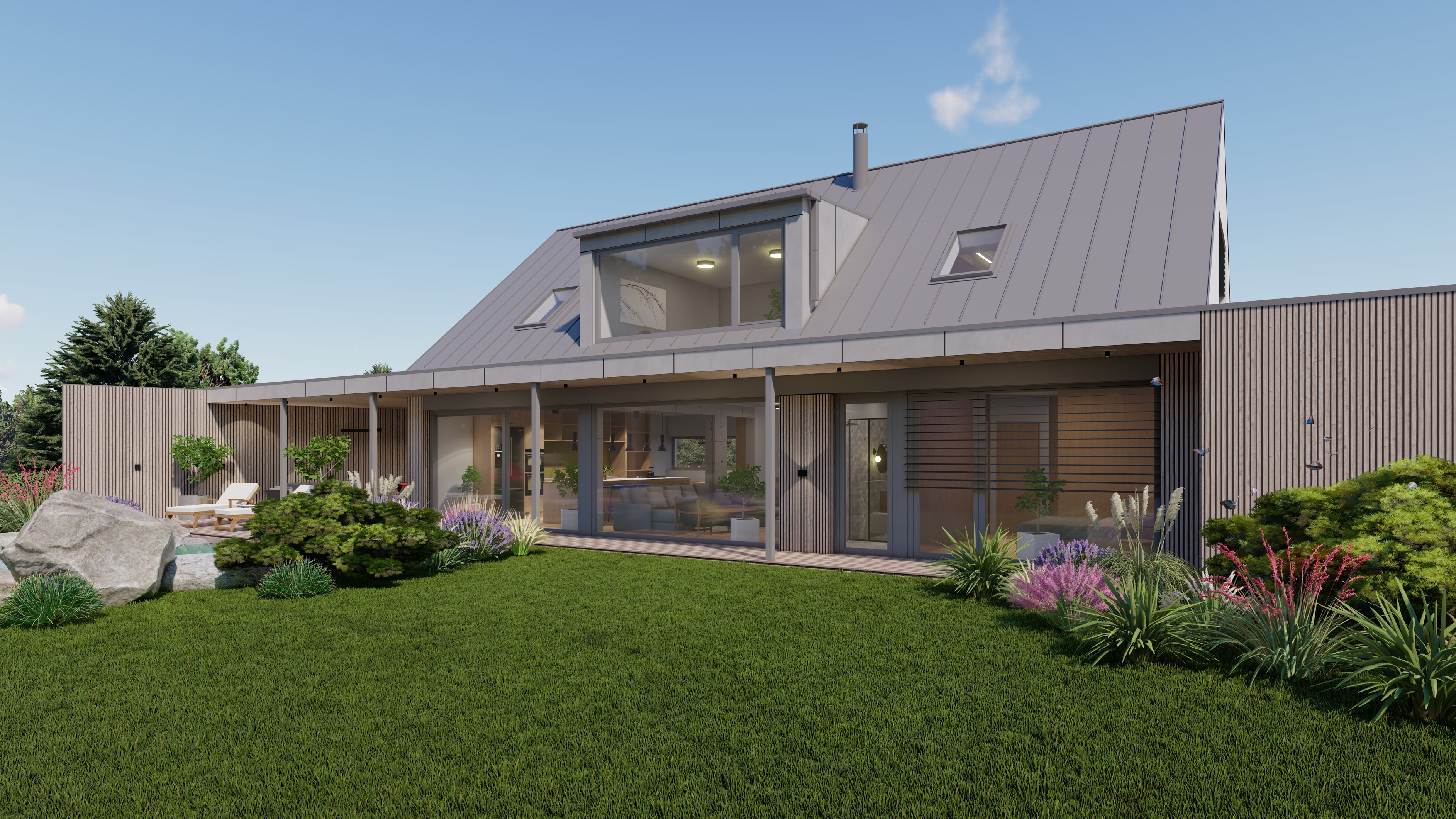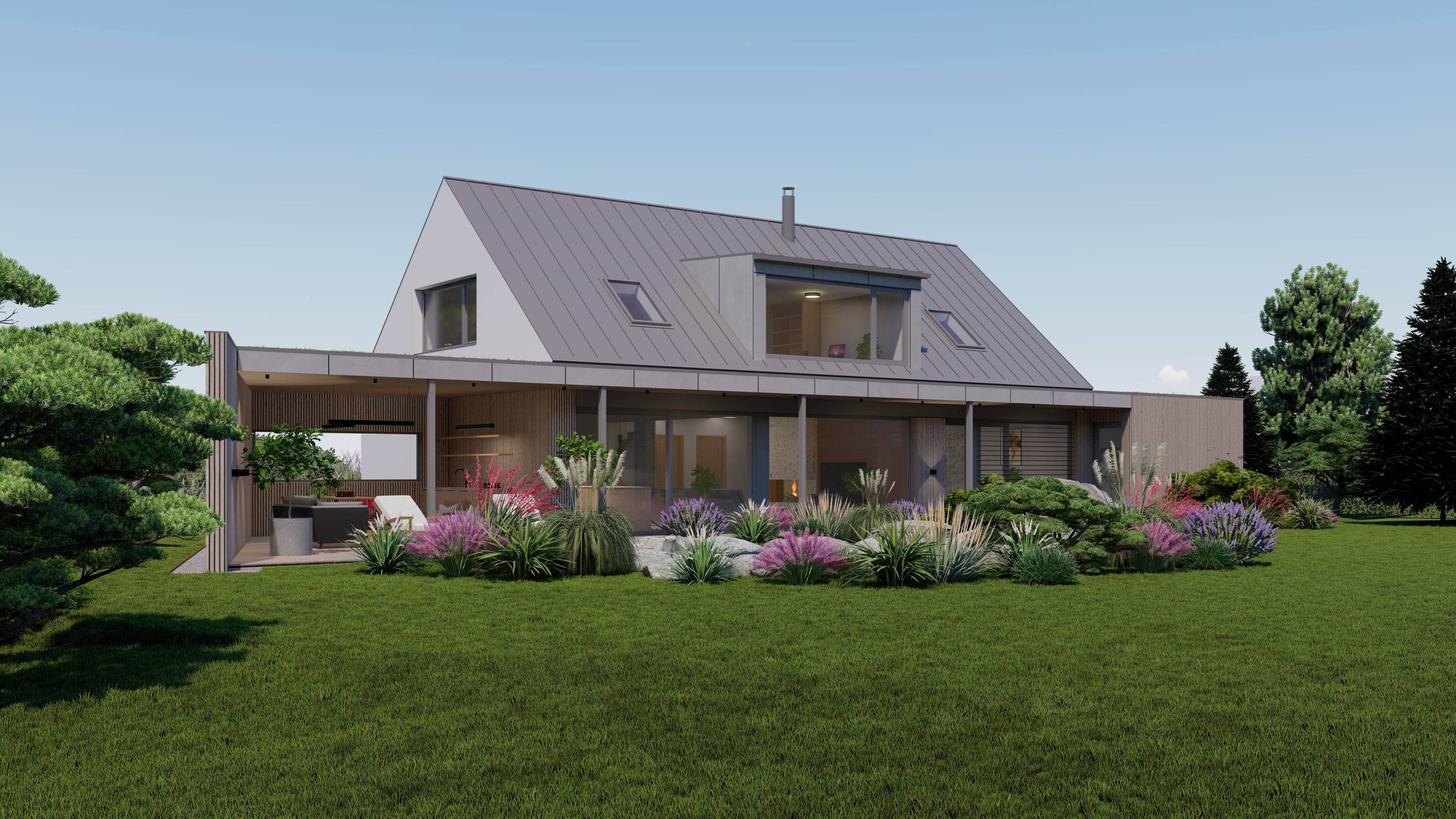 POZEMEK LEŽÍ VE VESNICI HLÁSNÁ LHOTA, NEDALEKO JIČÍNA. JEDNÁ SE O OBJEKT RODINNÉHO DOMU, PROVOZNĚ SPOJENÝ S GARÁŽÍ A TERASOU. HMOTA DOMU JE PATRNÁ PODLE ŠIKMÉ STŘECHY, KTERÁ ZASTŘEŠUJE ČÁST DOMU. PLOCHÁ STŘECHA NAVAZUJÍCÍ HMOTY JE Z JEDNÉ STRANY GARÁŽÍ A Z DRUHÉ STRANY PŘYKRYTOU TERASOU, NA KTEROU NAVAZUJE KOUPACÍ JEZÍRKO.