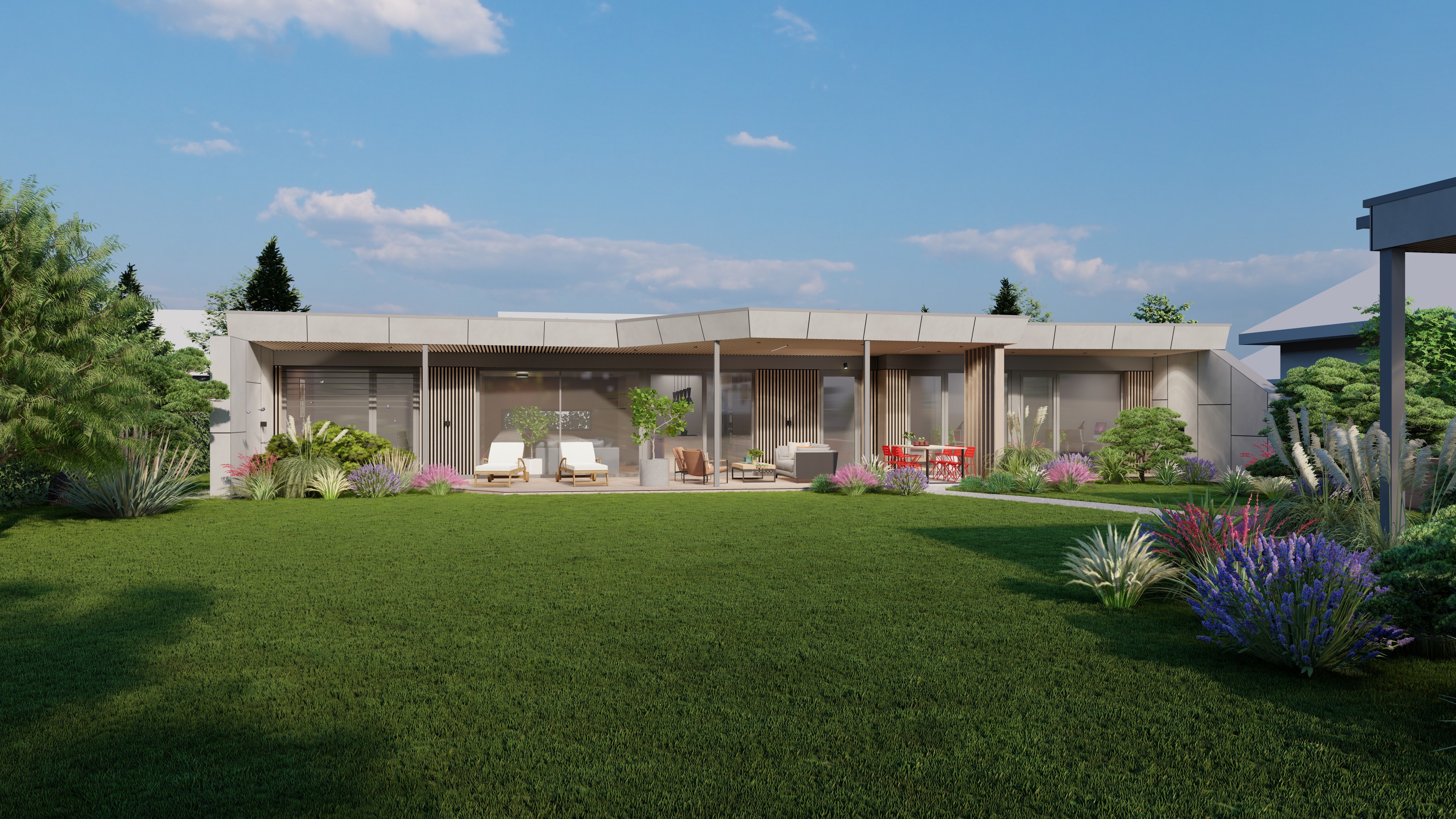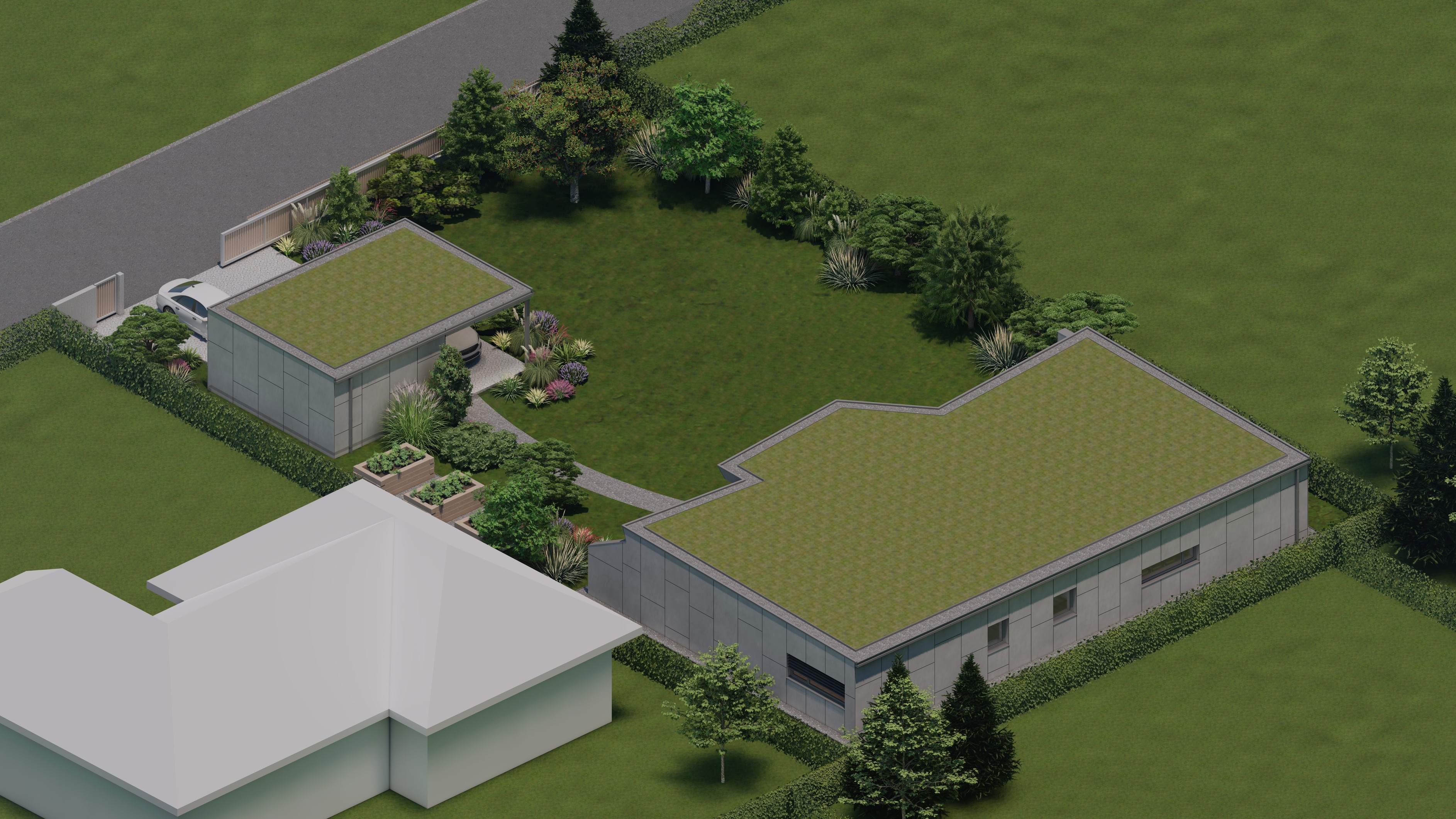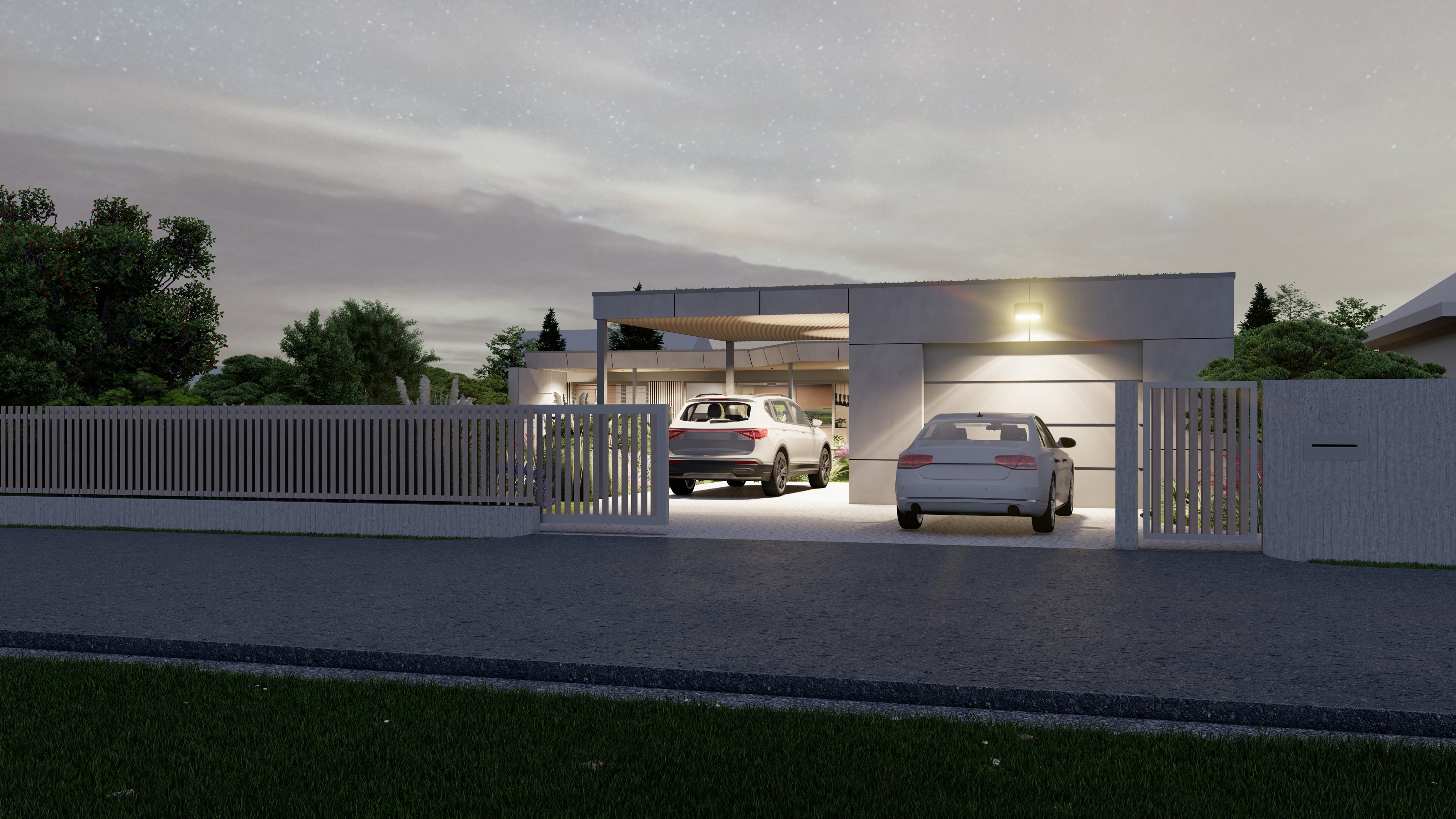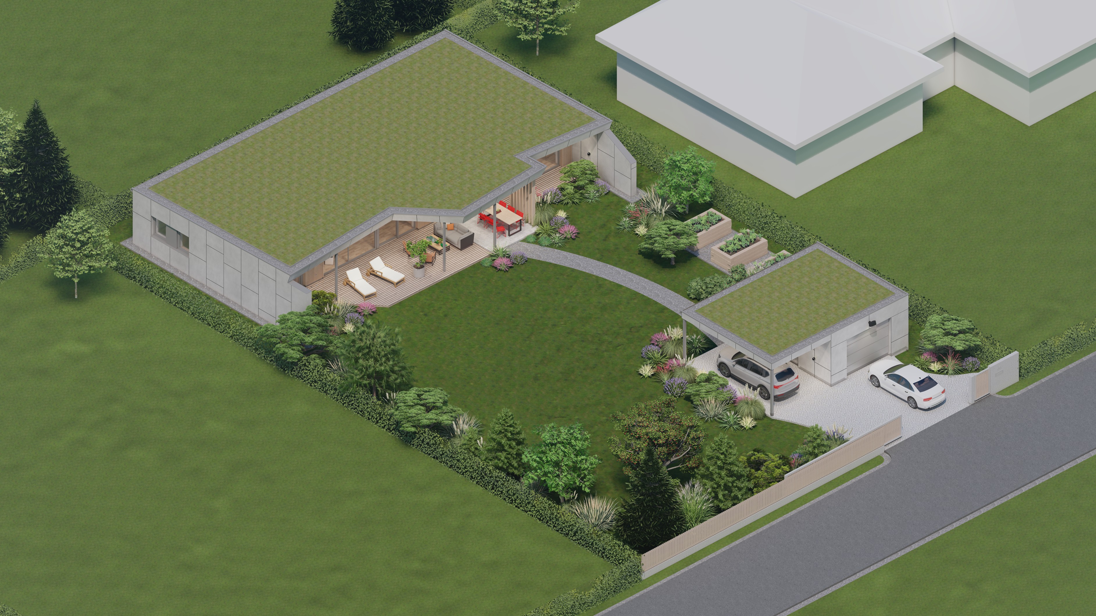 PŘÍZEMNÍ DŮM S GARÁŽÍ A PŘÍSTŘEŠKEM PRO PARKOVÁNÍ. POZEMEK JE OBDÉLNÍKOVÉHO TVARU, SKLONITÝ OD SEVERU K JIHU. NA JIŽNÍ STRANĚ JE VJEZD NA POZEMEK, NA KTERÝ NAVAZUJE GARÁŽ. ZA NÍ SE ROZVÍJÍ ZAHRADA, KTERÁ JE AŽ K SAMOTNÉ STAVBĚ DOMU, KTERÝ JE USAZEN K SEVERNÍ HRANICI POZEMKU, ABY ZAHRADA BYLA CO NEJVĚTŠÍ. VŠECHNY OBYTNÉ MÍSTNOSTI JSOU OTEVŘENY DO ZAHRADY.