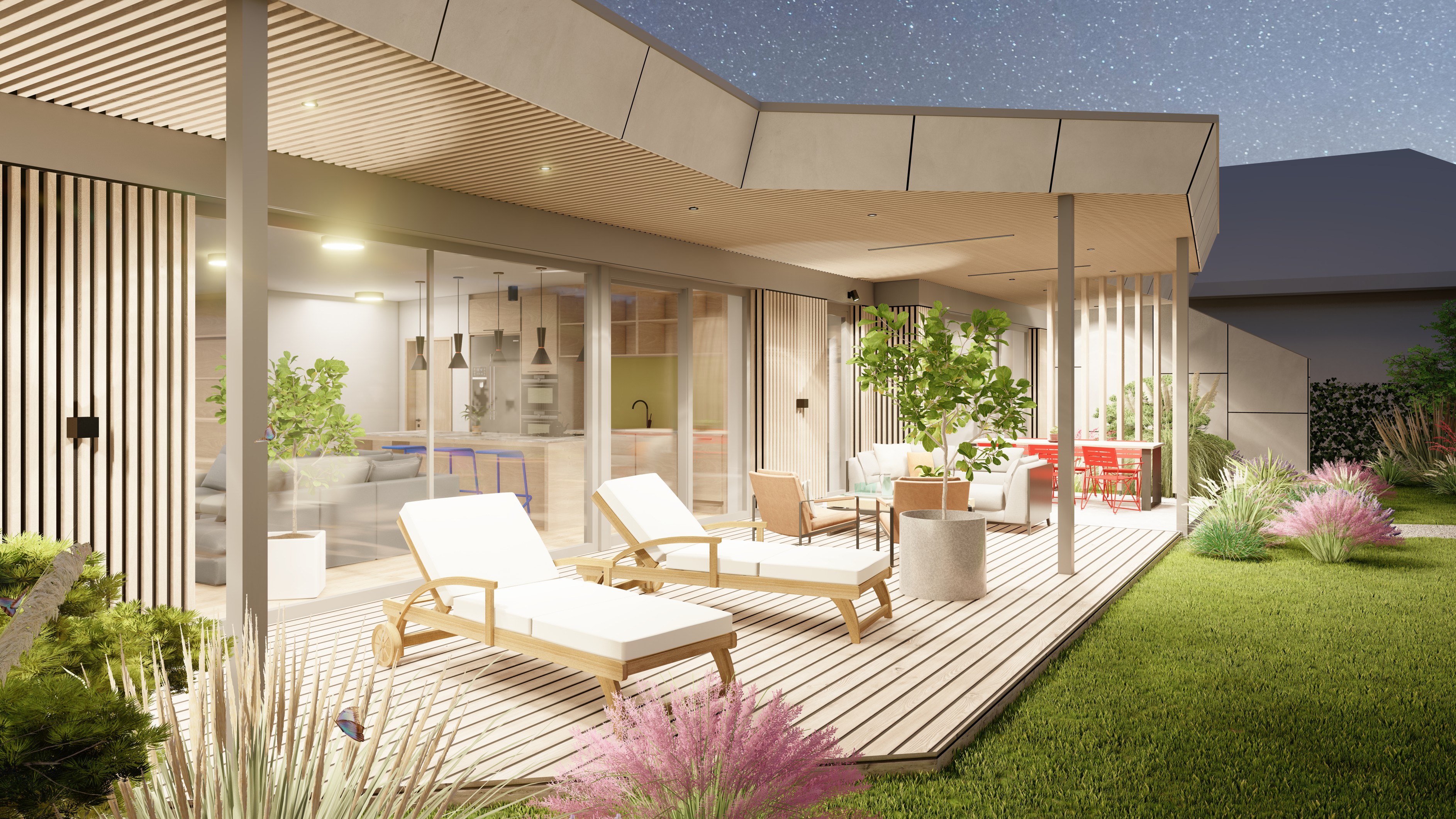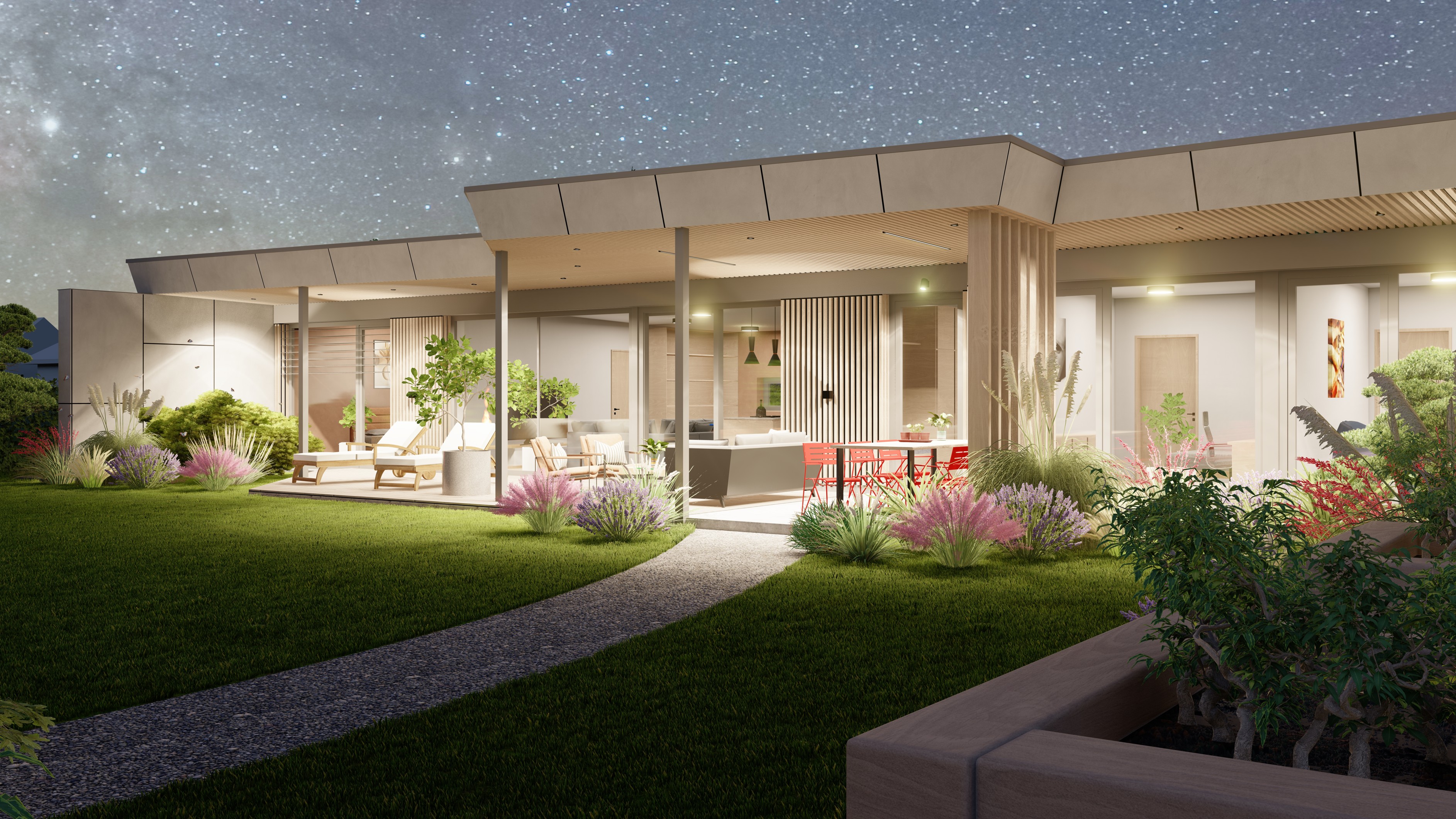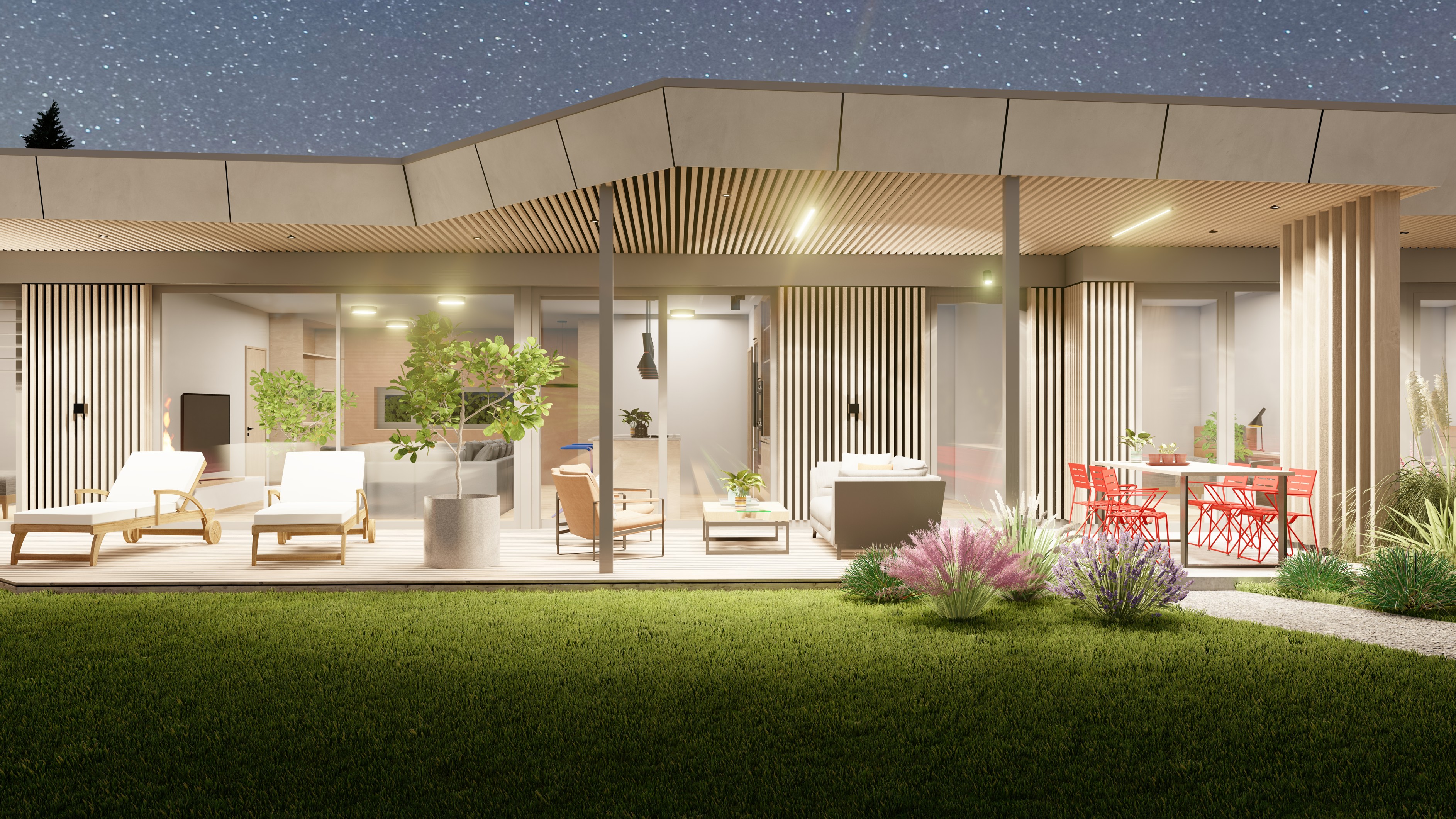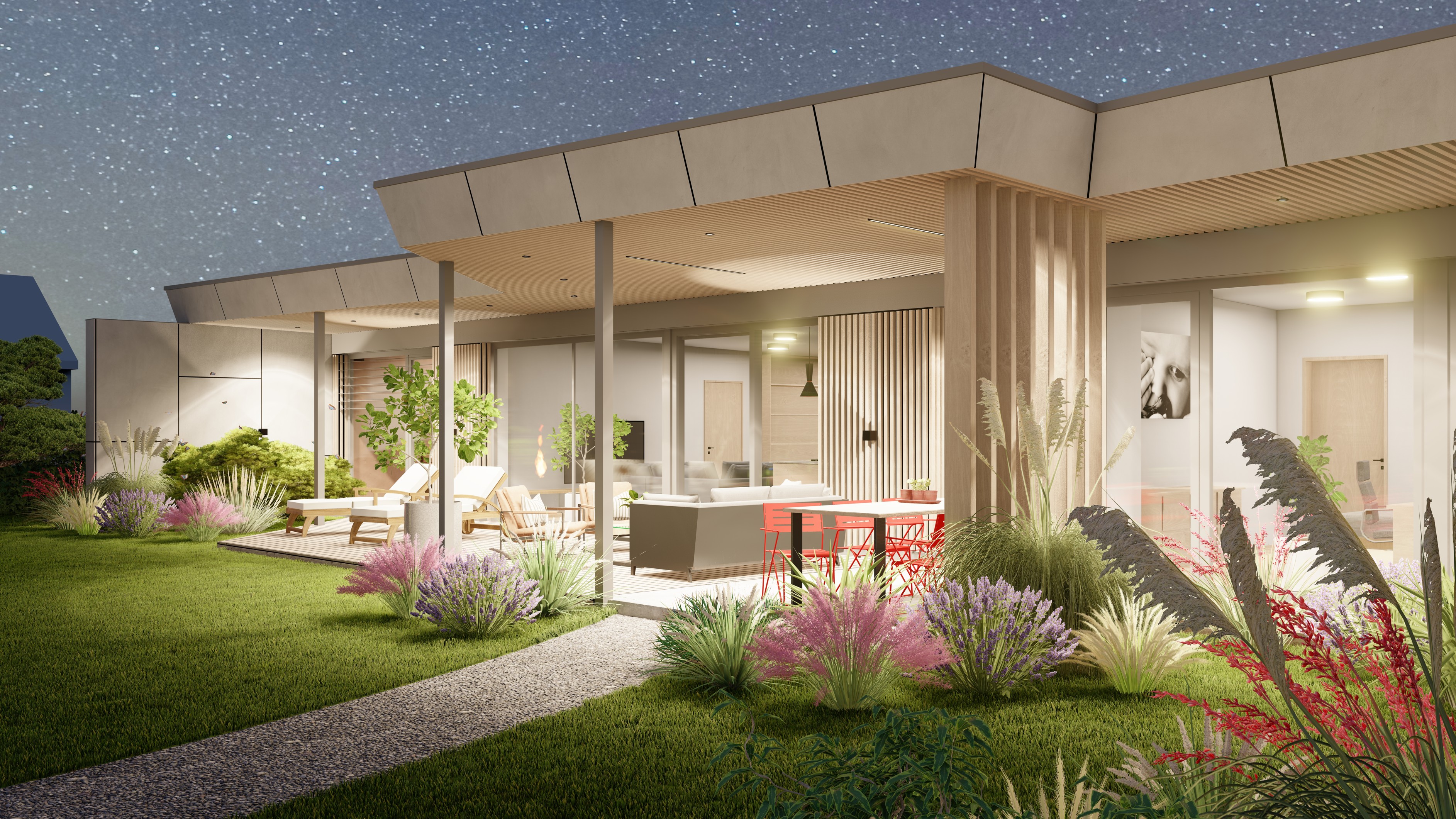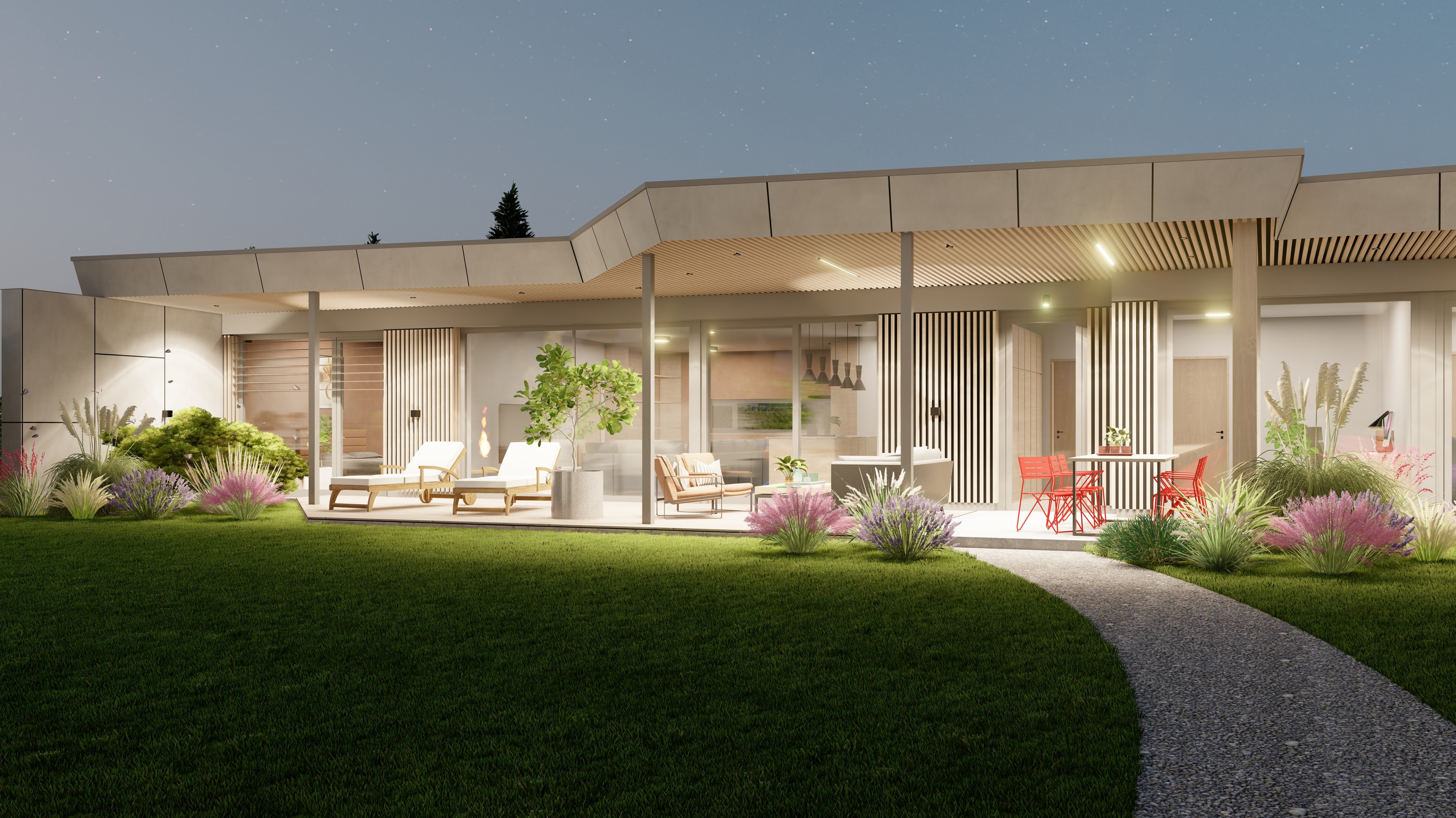 PŘÍZEMNÍ DŮM S GARÁŽÍ A PŘÍSTŘEŠKEM PRO PARKOVÁNÍ. POZEMEK JE OBDÉLNÍKOVÉHO TVARU, SKLONITÝ OD SEVERU K JIHU. NA JIŽNÍ STRANĚ JE VJEZD NA POZEMEK, NA KTERÝ NAVAZUJE GARÁŽ. ZA NÍ SE ROZVÍJÍ ZAHRADA, KTERÁ JE AŽ K SAMOTNÉ STAVBĚ DOMU, KTERÝ JE USAZEN K SEVERNÍ HRANICI POZEMKU, ABY ZAHRADA BYLA CO NEJVĚTŠÍ. VŠECHNY OBYTNÉ MÍSTNOSTI JSOU OTEVŘENY DO ZAHRADY.