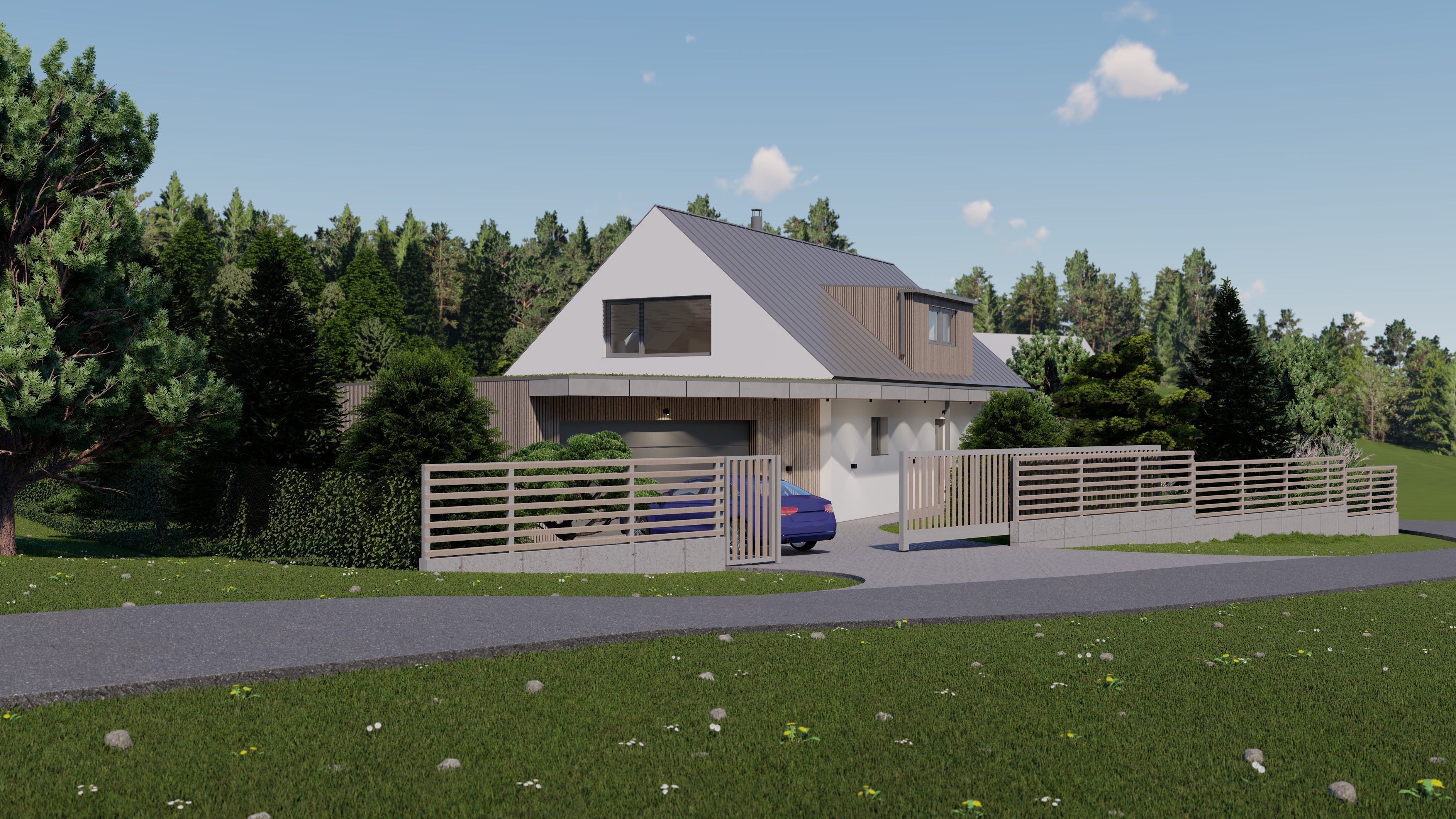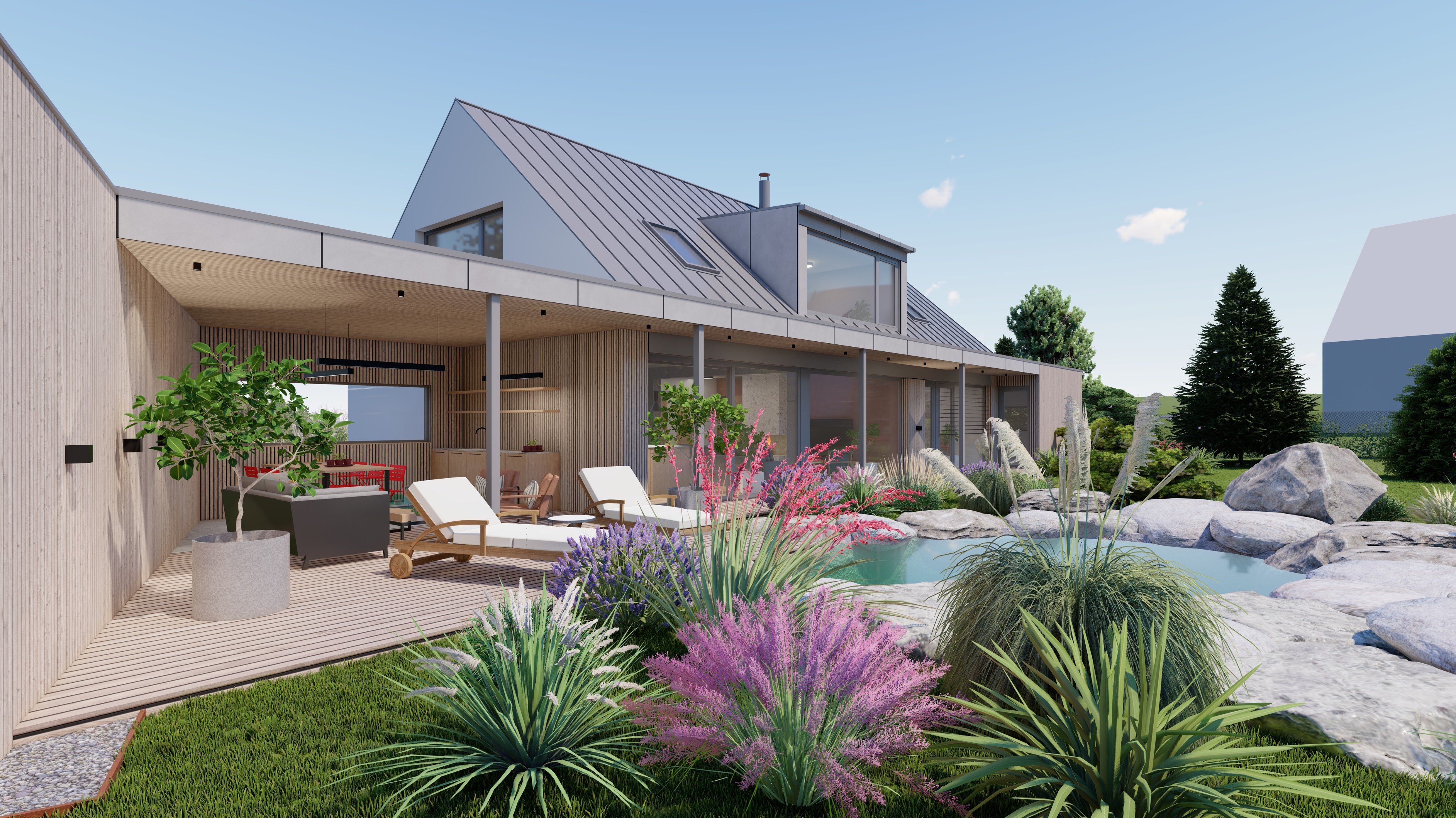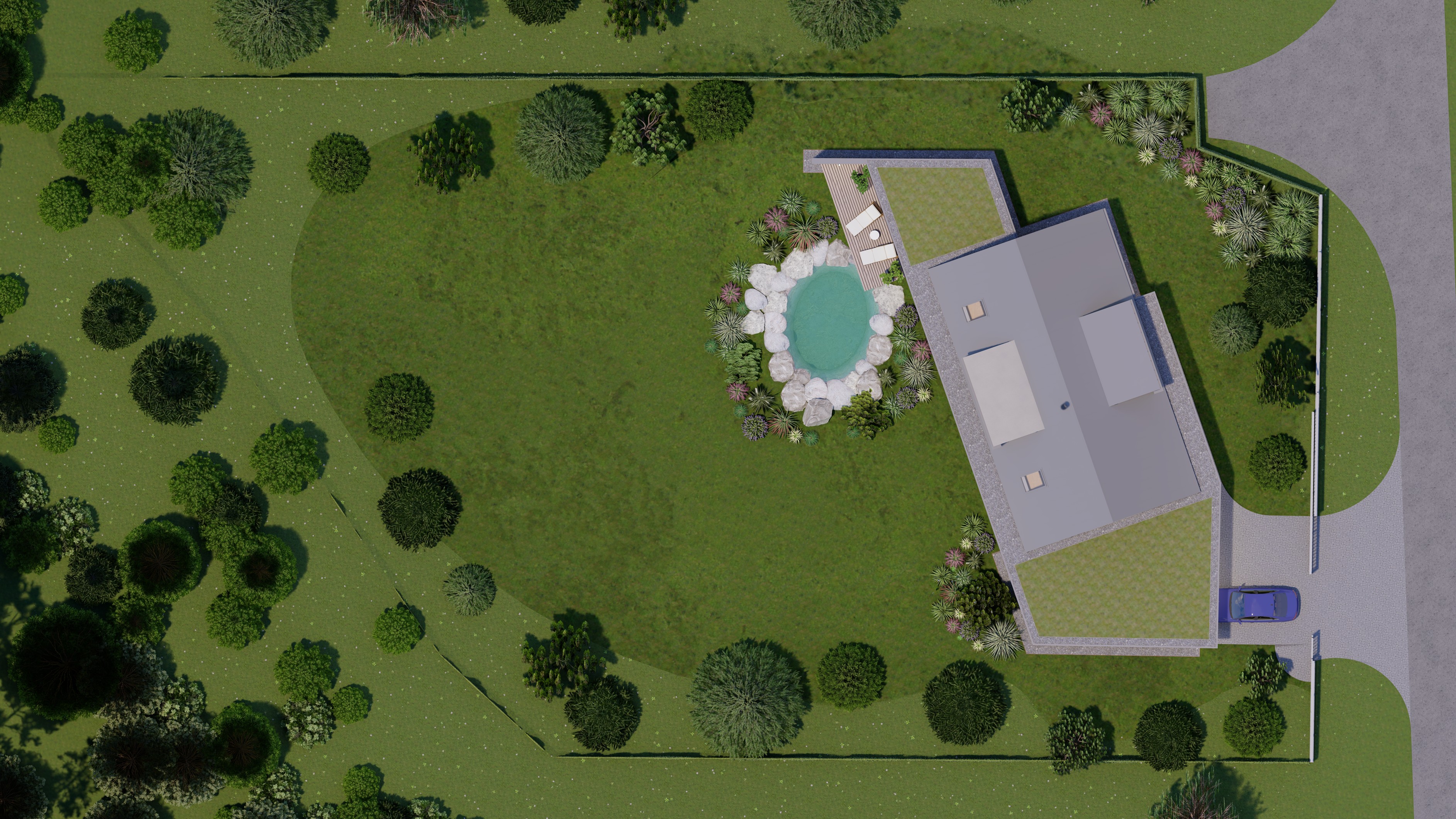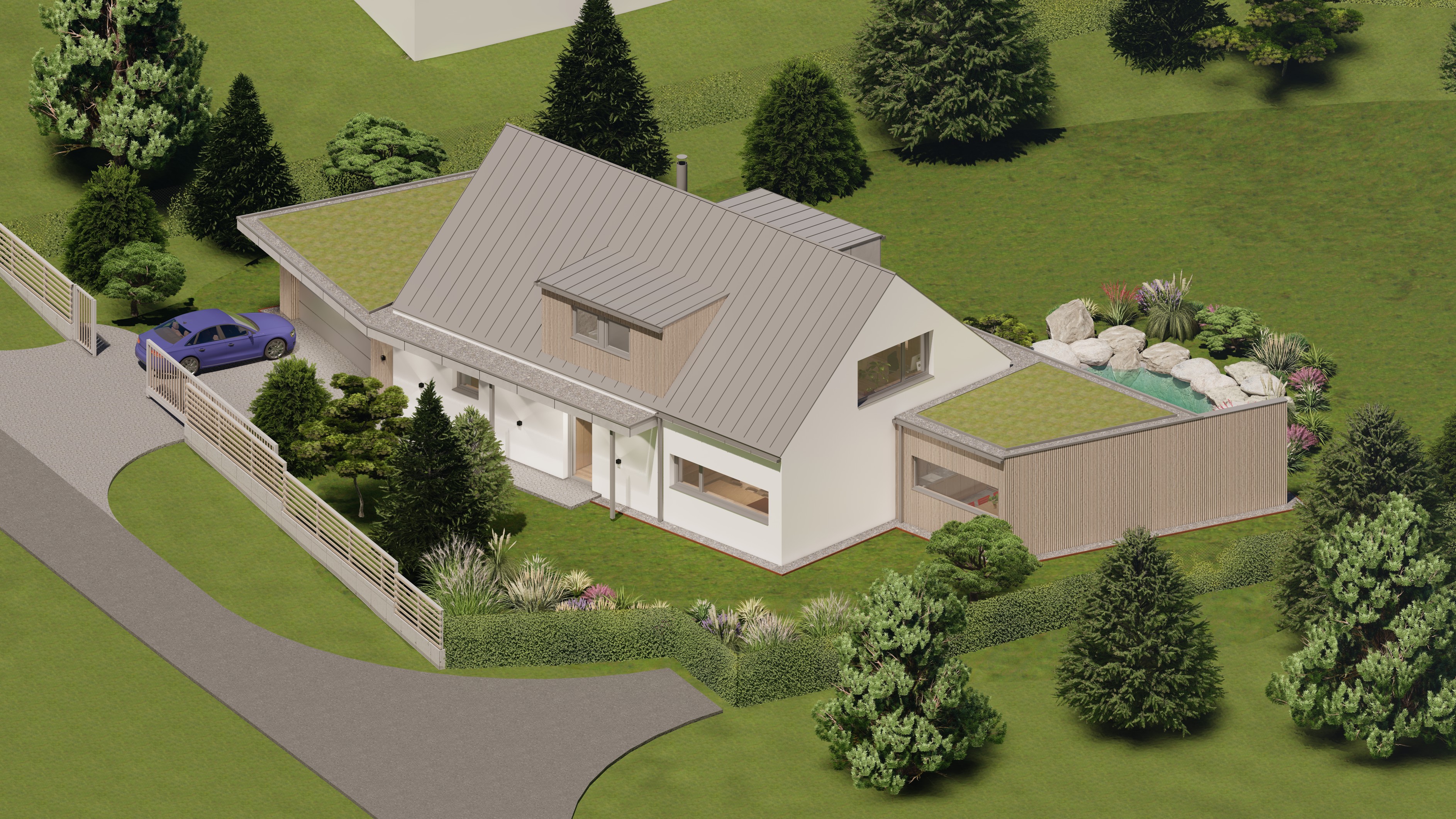 POZEMEK LEŽÍ VE VESNICI HLÁSNÁ LHOTA, NEDALEKO JIČÍNA. JEDNÁ SE O OBJEKT RODINNÉHO DOMU, PROVOZNĚ SPOJENÝ S GARÁŽÍ A TERASOU. HMOTA DOMU JE PATRNÁ PODLE ŠIKMÉ STŘECHY, KTERÁ ZASTŘEŠUJE ČÁST DOMU. PLOCHÁ STŘECHA NAVAZUJÍCÍ HMOTY JE Z JEDNÉ STRANY GARÁŽÍ A Z DRUHÉ STRANY PŘYKRYTOU TERASOU, NA KTEROU NAVAZUJE KOUPACÍ JEZÍRKO.