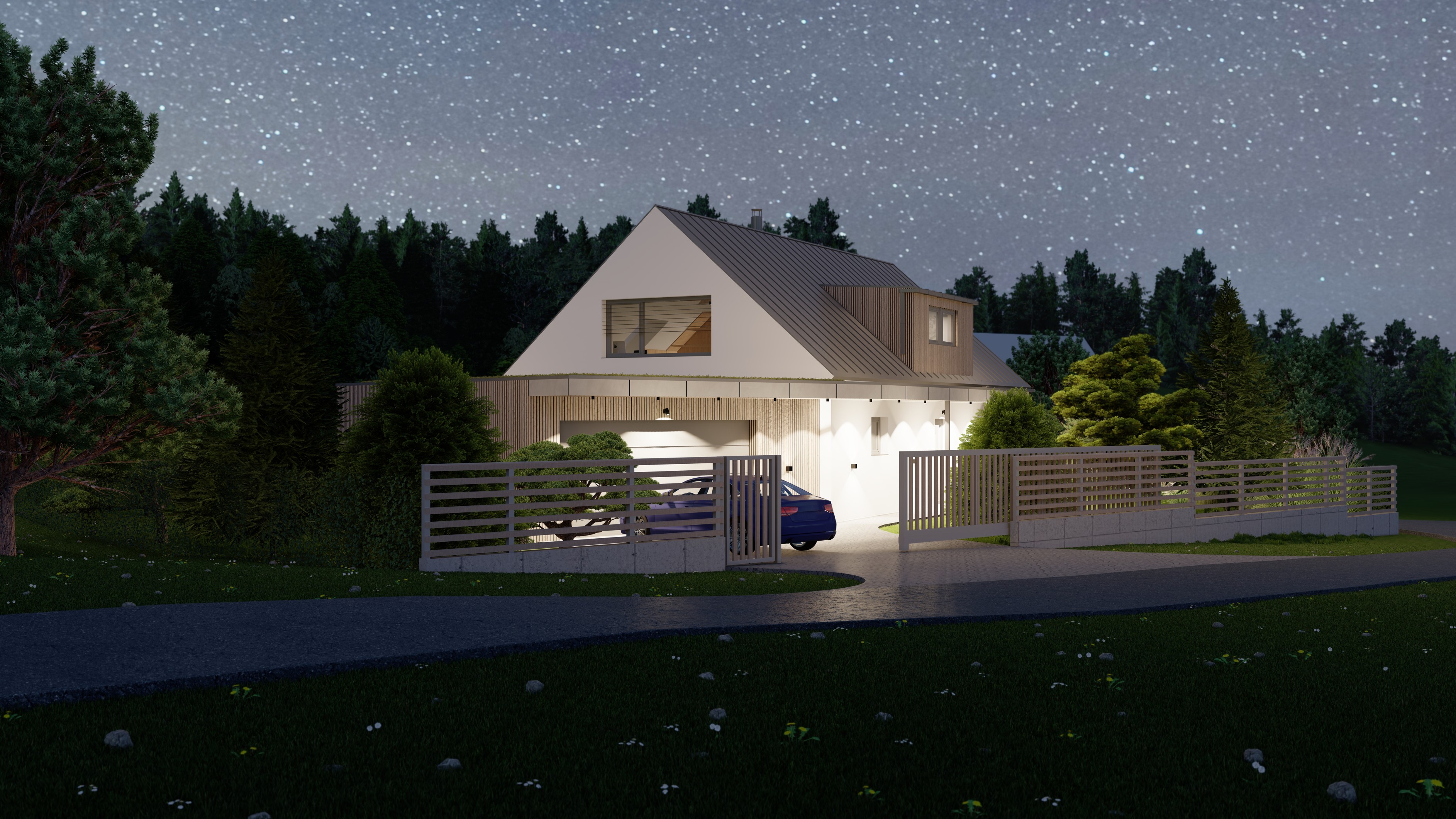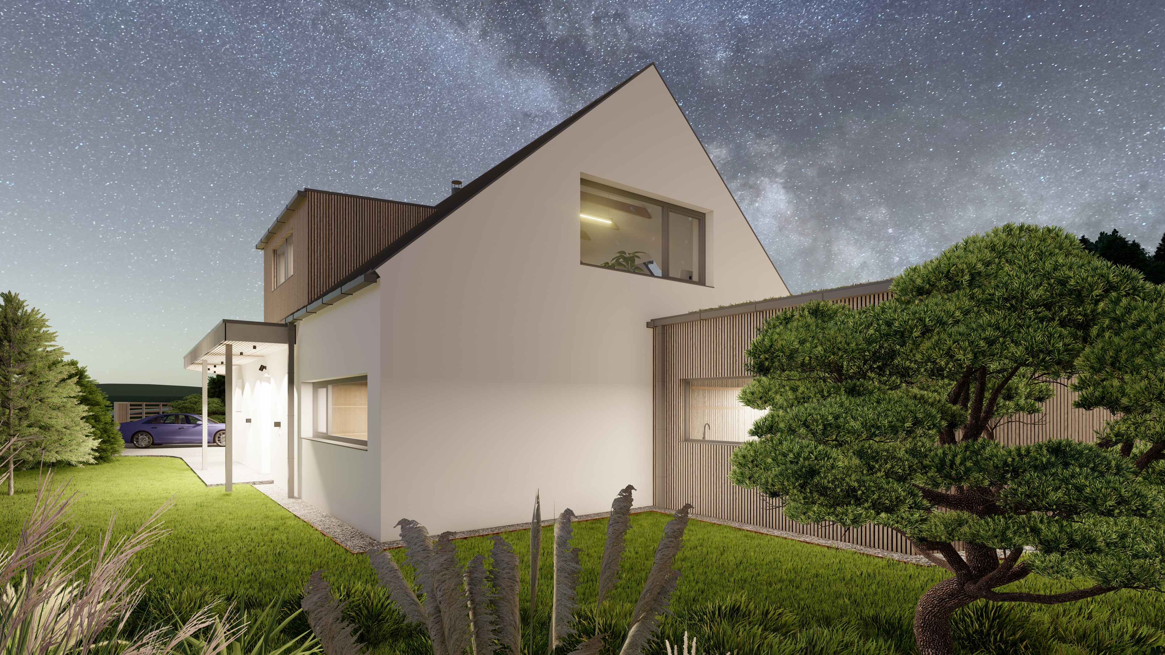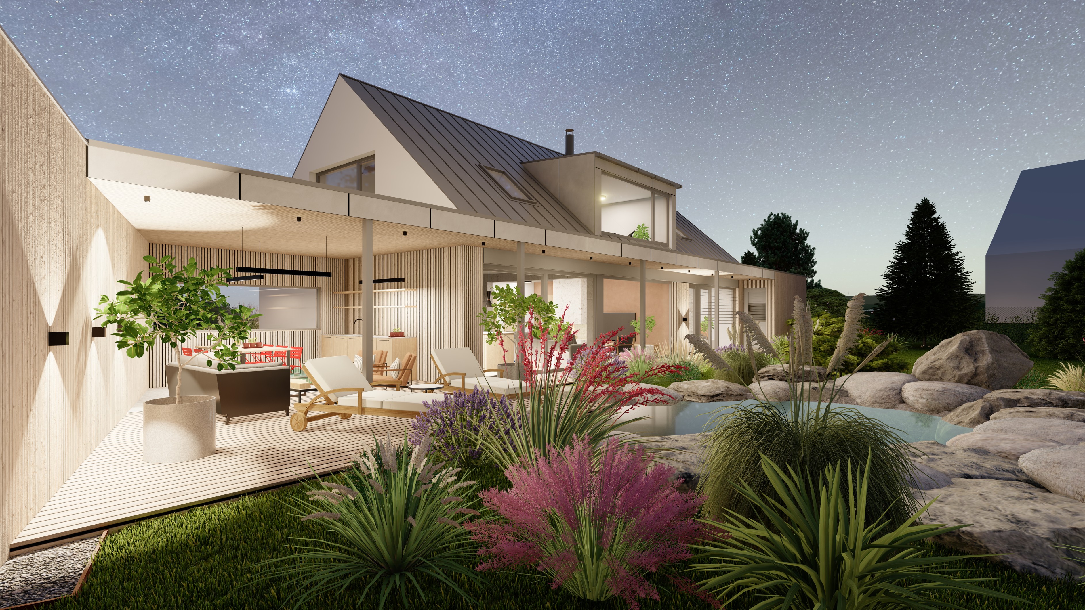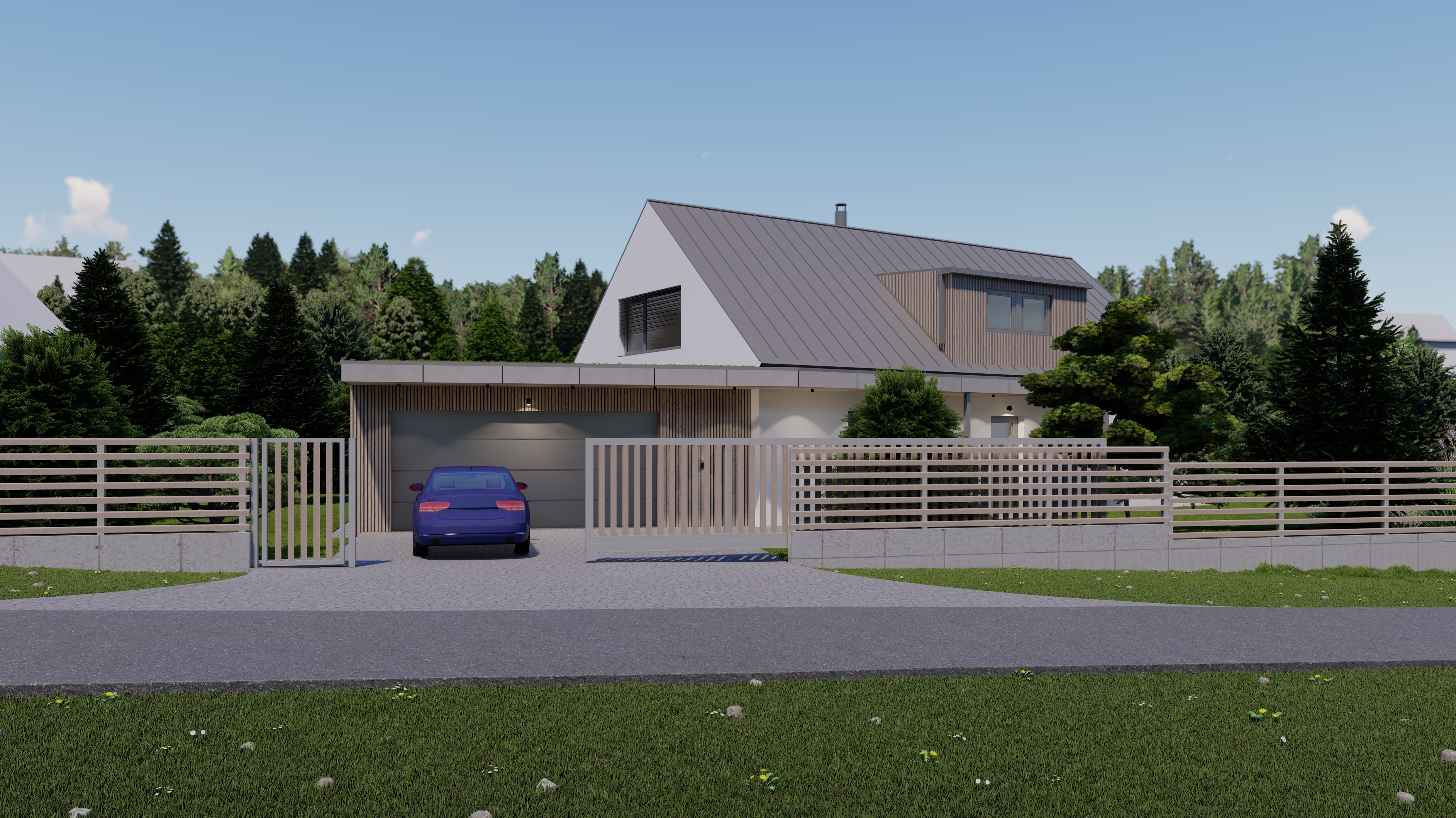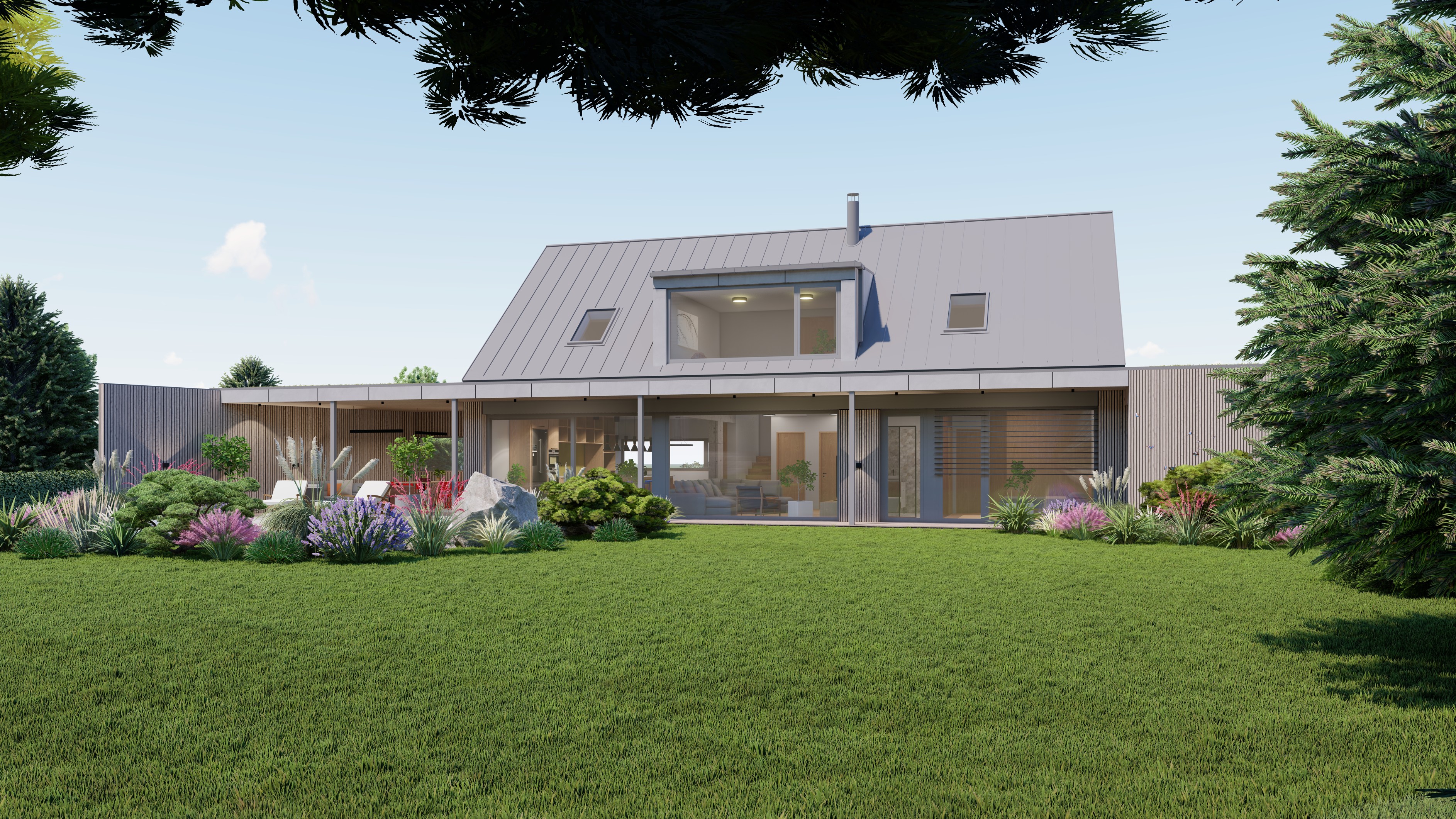 POZEMEK LEŽÍ VE VESNICI HLÁSNÁ LHOTA, NEDALEKO JIČÍNA. JEDNÁ SE O OBJEKT RODINNÉHO DOMU, PROVOZNĚ SPOJENÝ S GARÁŽÍ A TERASOU. HMOTA DOMU JE PATRNÁ PODLE ŠIKMÉ STŘECHY, KTERÁ ZASTŘEŠUJE ČÁST DOMU. PLOCHÁ STŘECHA NAVAZUJÍCÍ HMOTY JE Z JEDNÉ STRANY GARÁŽÍ A Z DRUHÉ STRANY PŘYKRYTOU TERASOU, NA KTEROU NAVAZUJE KOUPACÍ JEZÍRKO.
