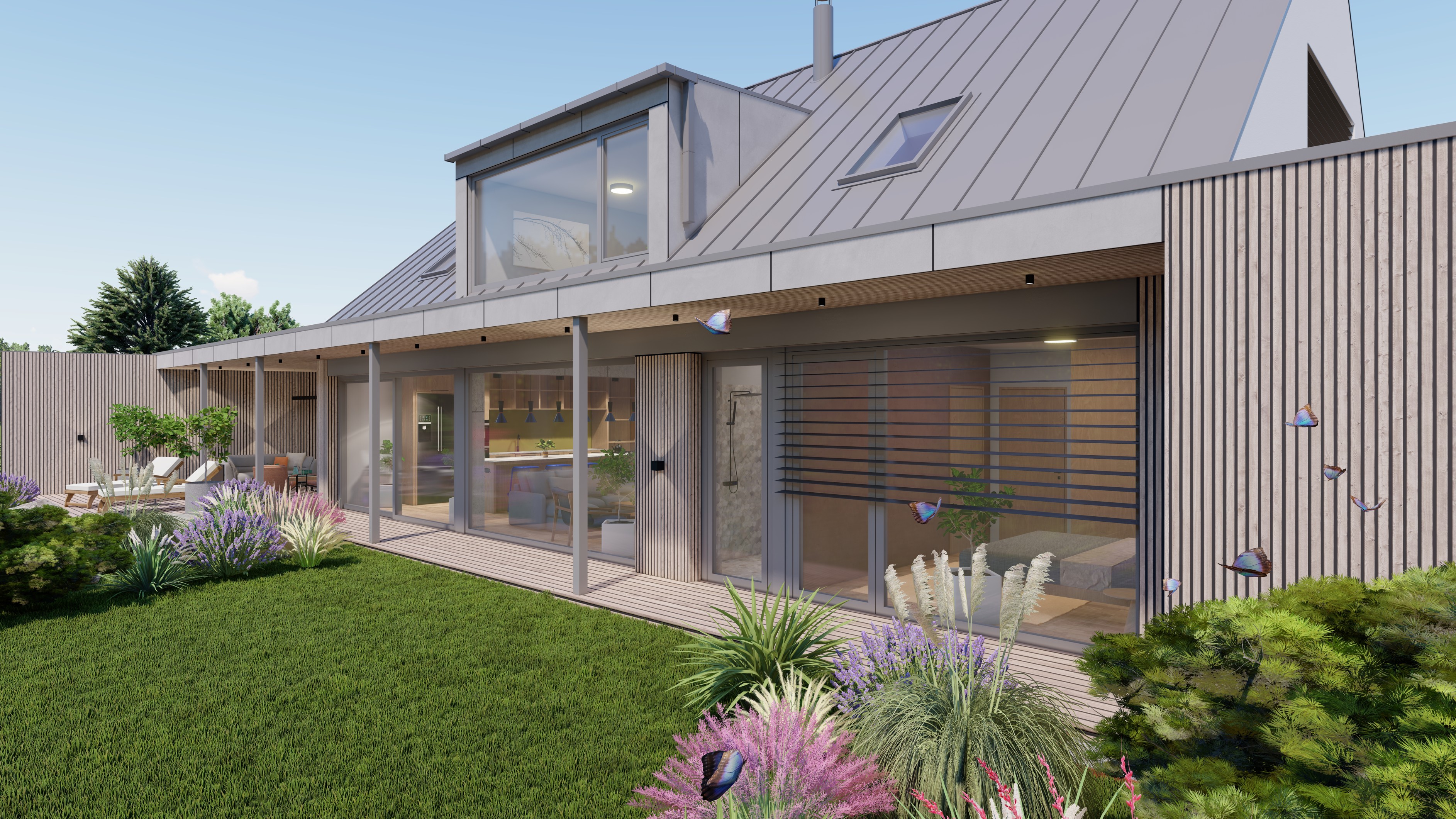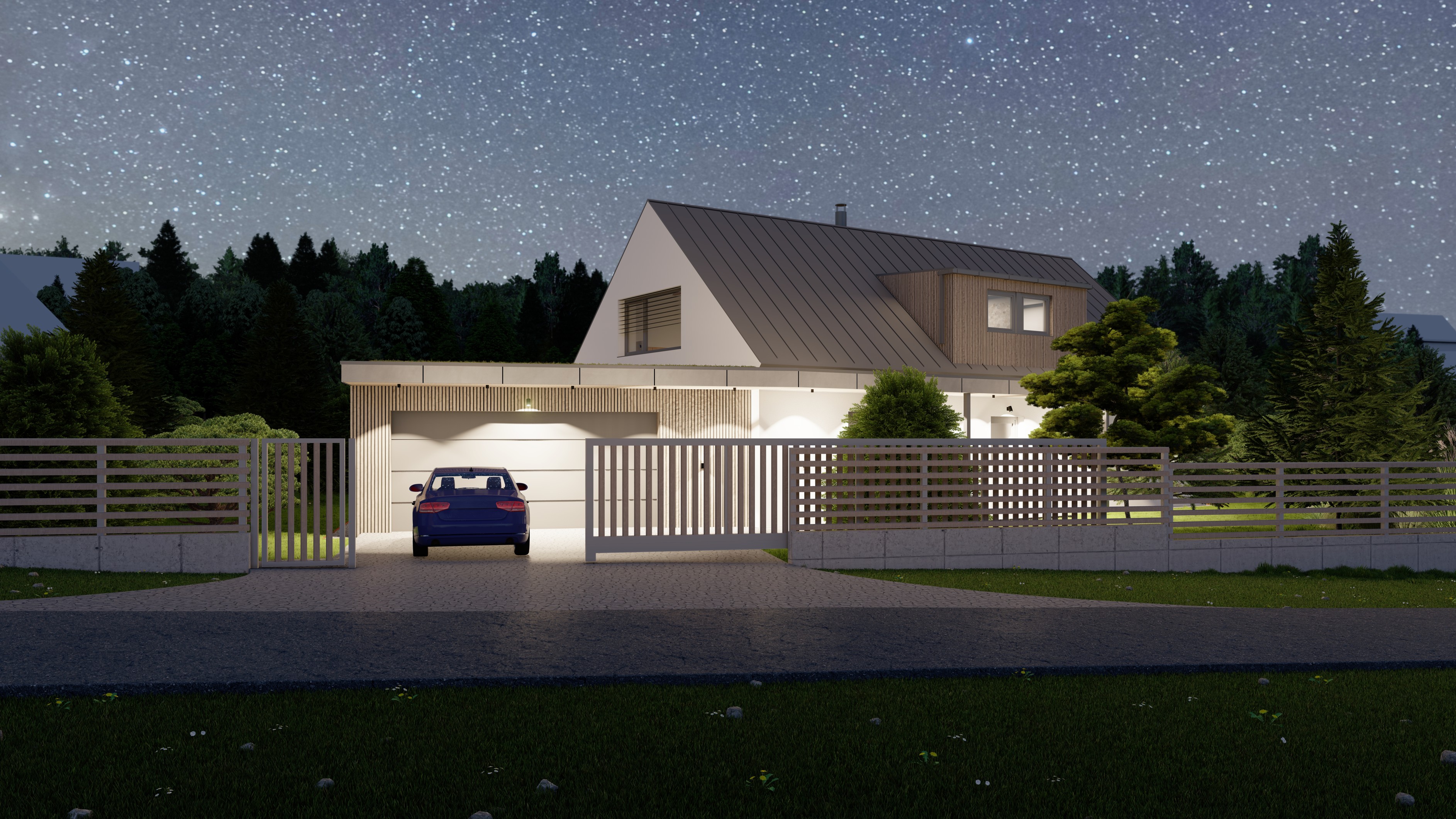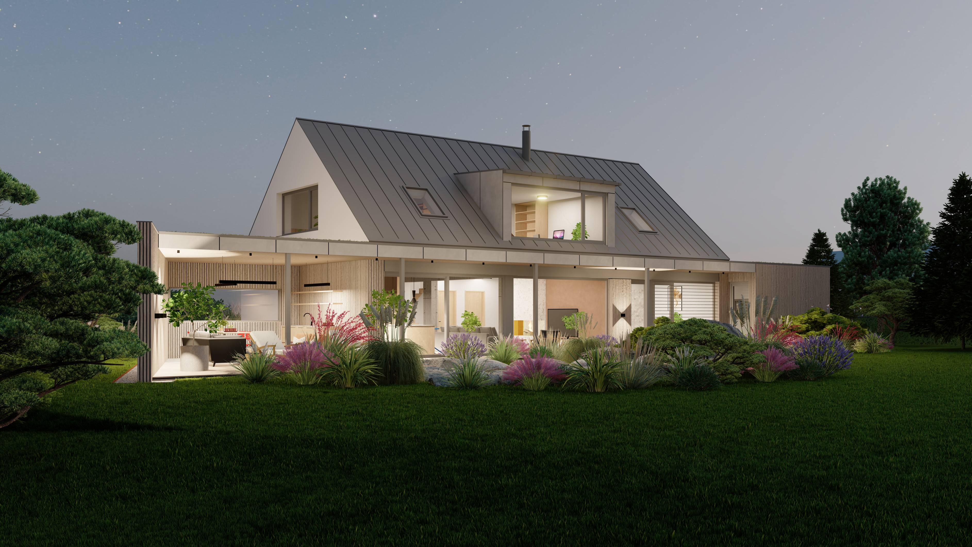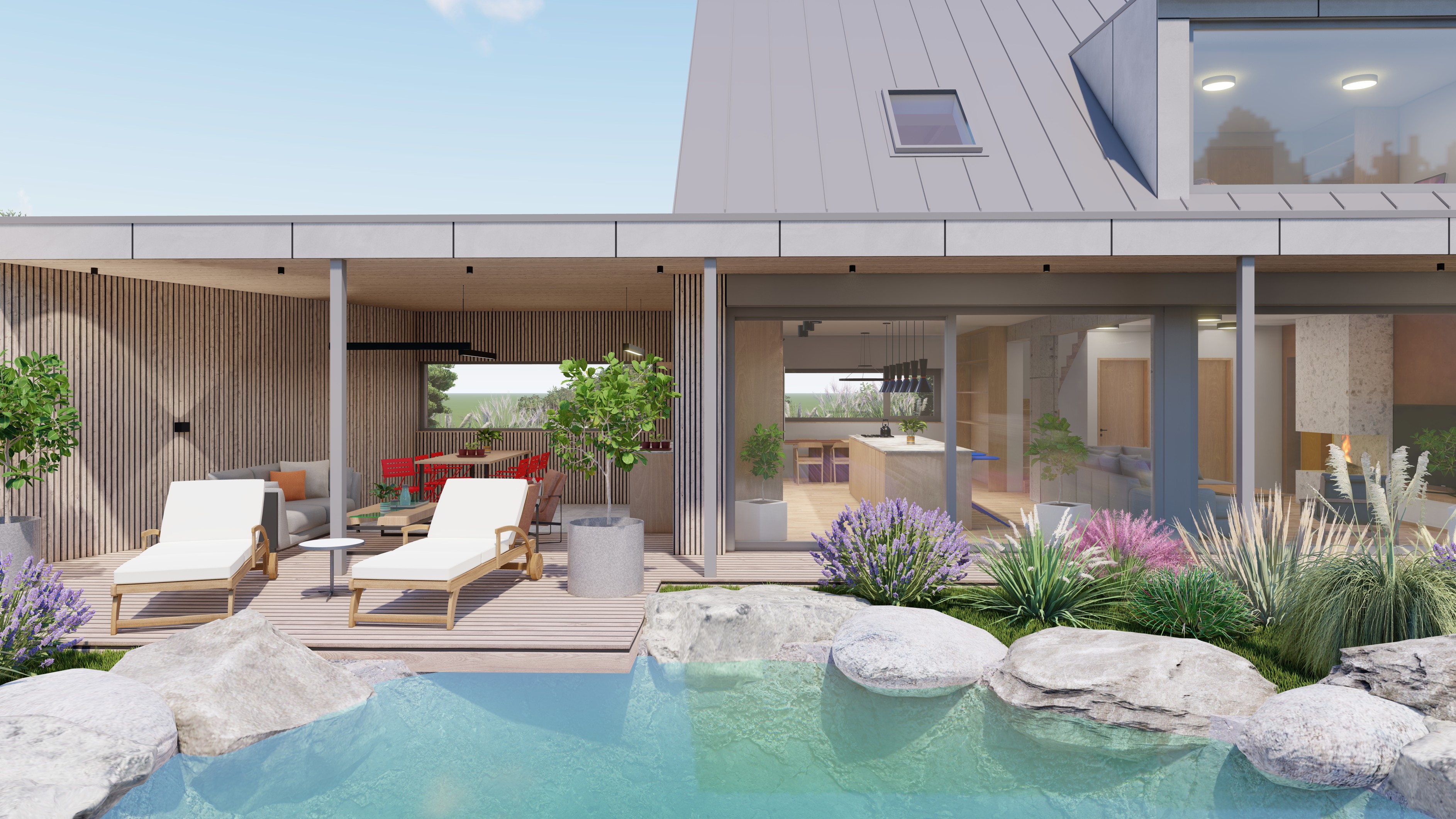 POZEMEK LEŽÍ VE VESNICI HLÁSNÁ LHOTA, NEDALEKO JIČÍNA. JEDNÁ SE O OBJEKT RODINNÉHO DOMU, PROVOZNĚ SPOJENÝ S GARÁŽÍ A TERASOU. HMOTA DOMU JE PATRNÁ PODLE ŠIKMÉ STŘECHY, KTERÁ ZASTŘEŠUJE ČÁST DOMU. PLOCHÁ STŘECHA NAVAZUJÍCÍ HMOTY JE Z JEDNÉ STRANY GARÁŽÍ A Z DRUHÉ STRANY PŘYKRYTOU TERASOU, NA KTEROU NAVAZUJE KOUPACÍ JEZÍRKO.